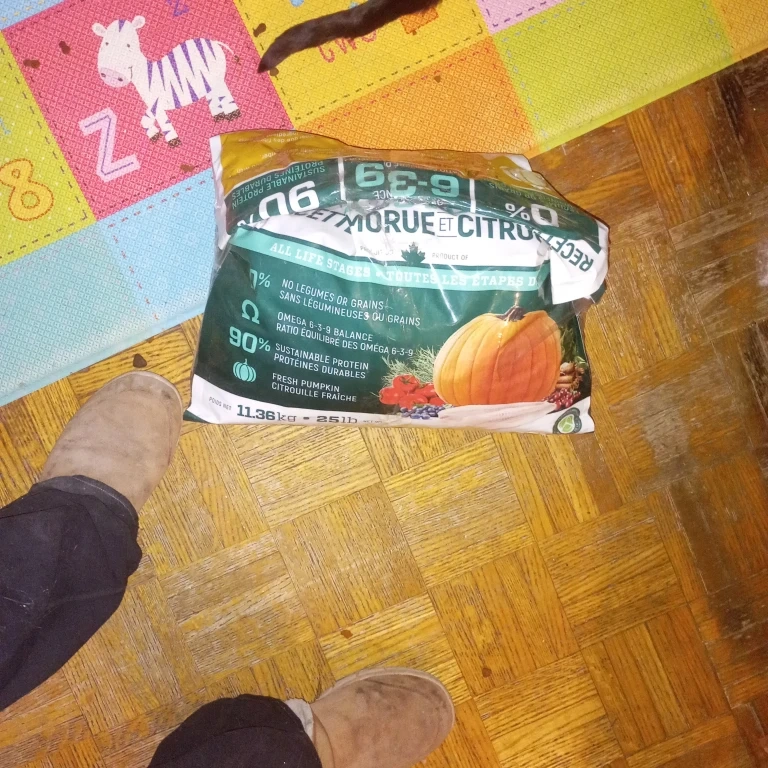 It's made with 90% sustainable protein and fresh pumpkin, and cod with no legumes or grains. Omega 6-3-9 balance is included.
