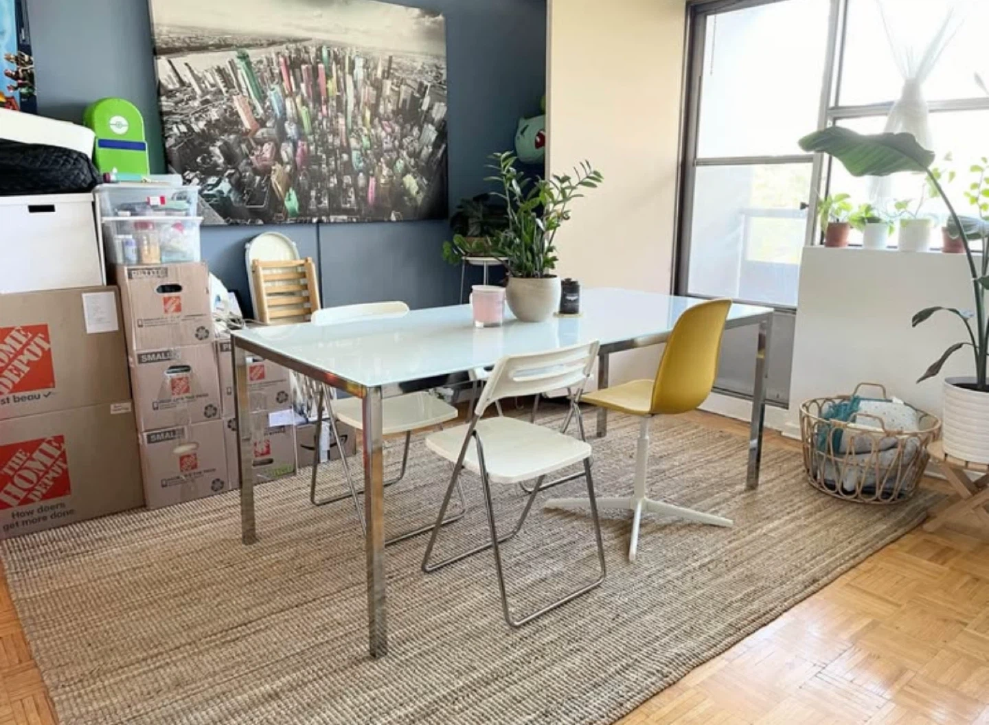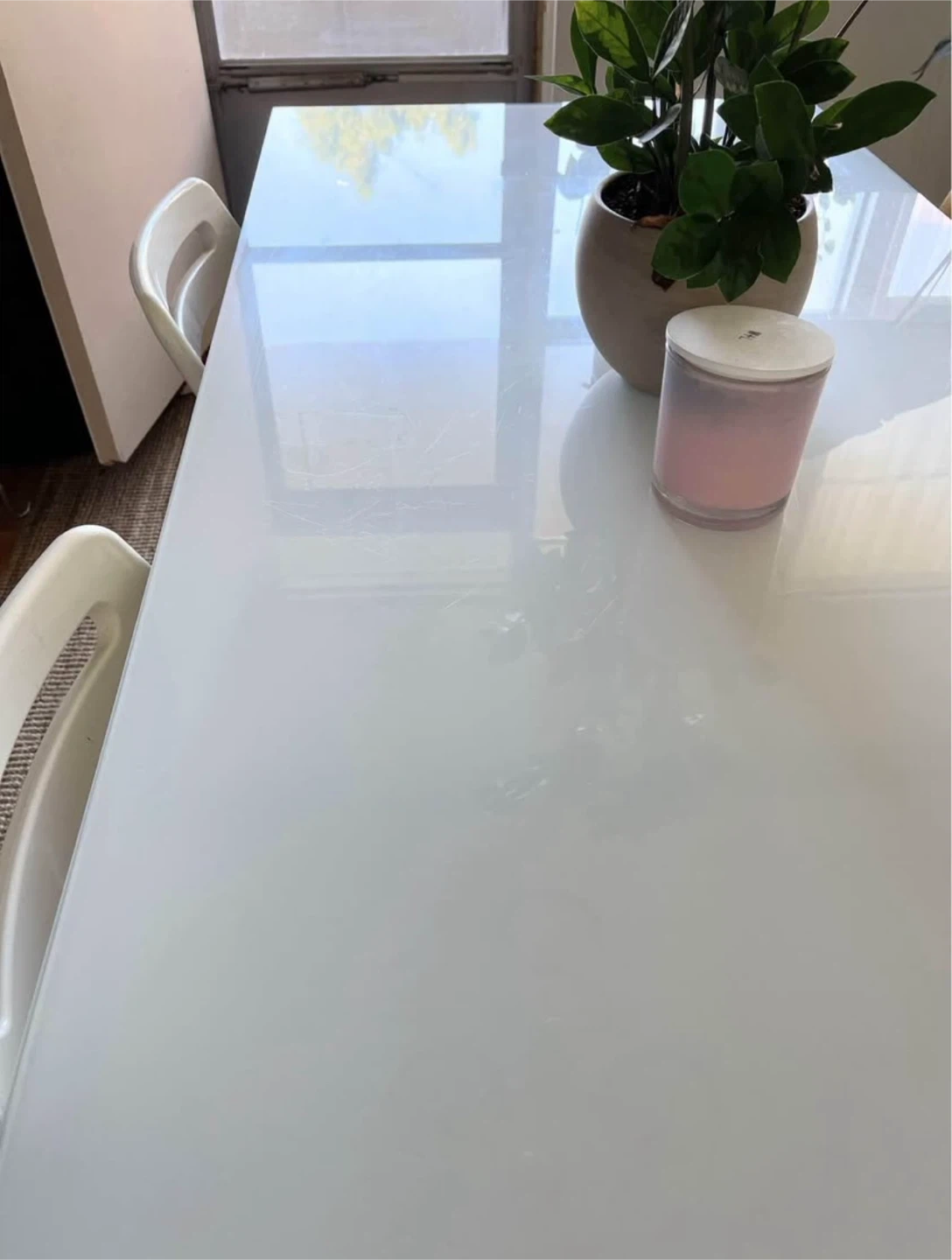 Glass top dining table with chrome legs. Some minor surface scratches on the tabletop.