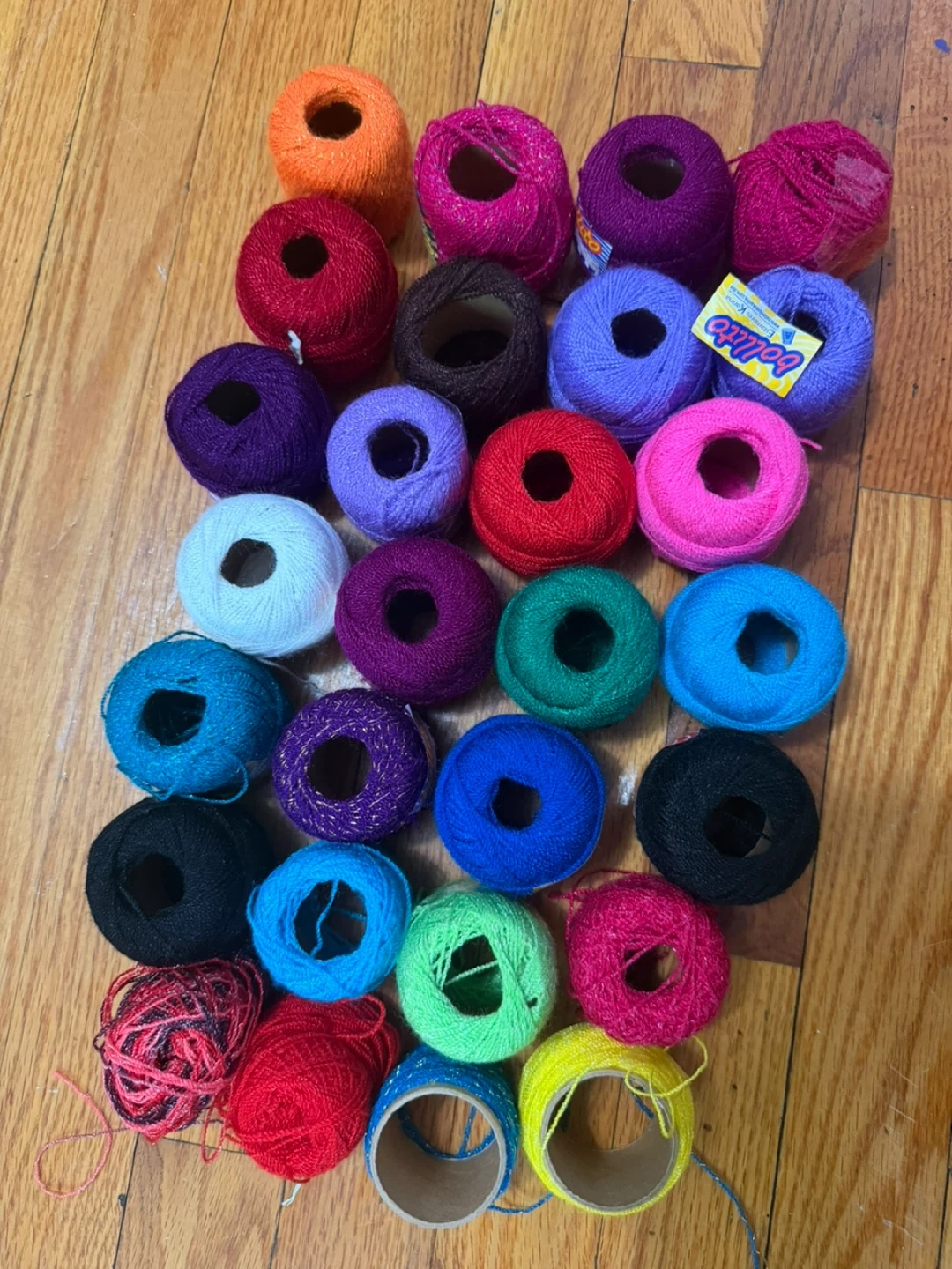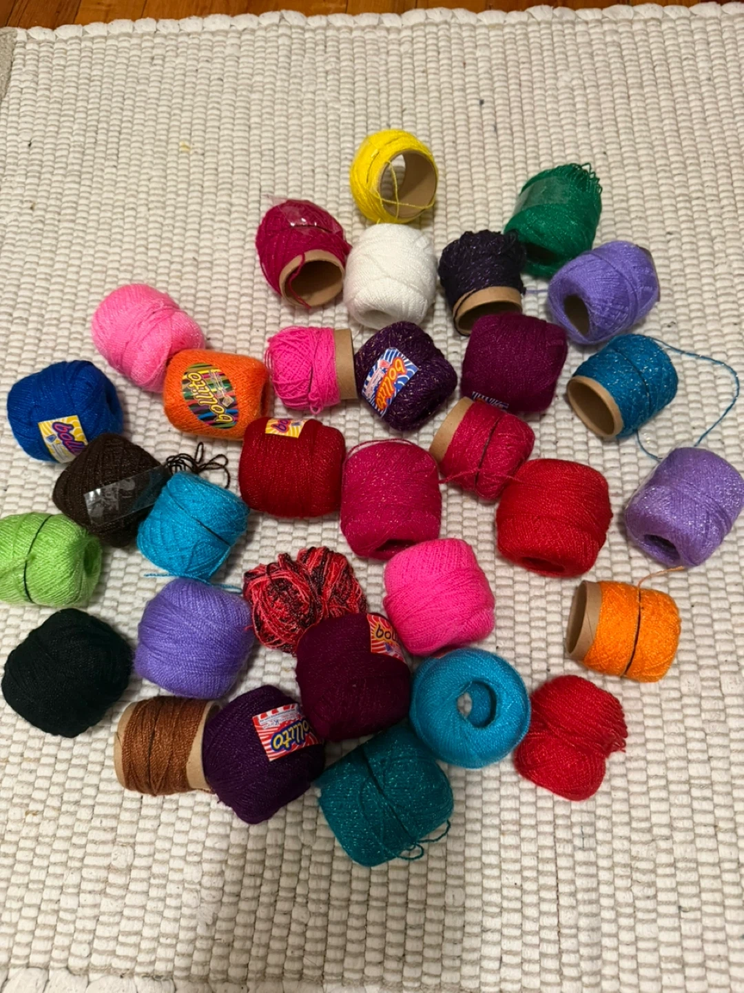 This is a lot of 29 skeins of yarn in various colors. Includes a variety of shades like orange, pink, purple, red, blue, green, white, and black. Some skeins have metallic threads. Ballito brand is visible on one label.