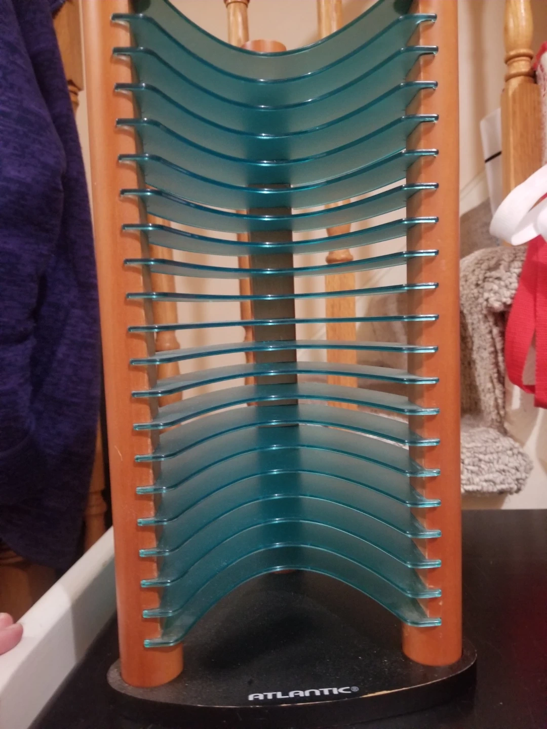 This Atlantic CD/DVD rack features a wooden frame with teal plastic shelves. It's designed to hold multiple discs. Great for organizing your media collection!