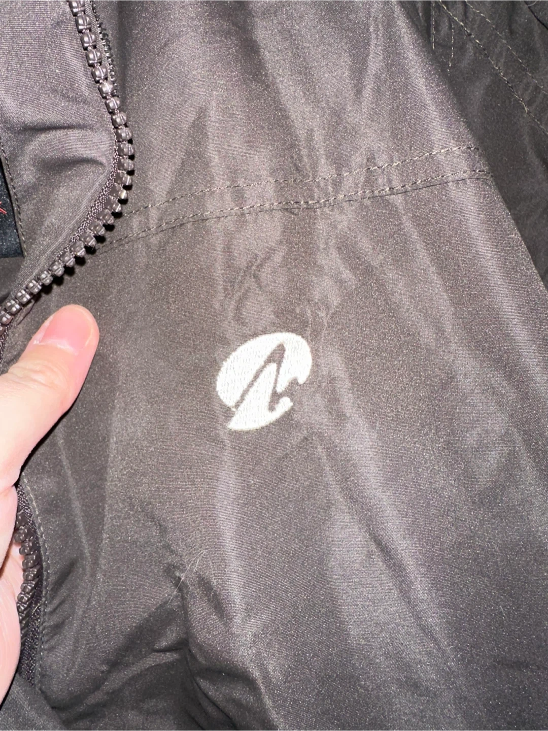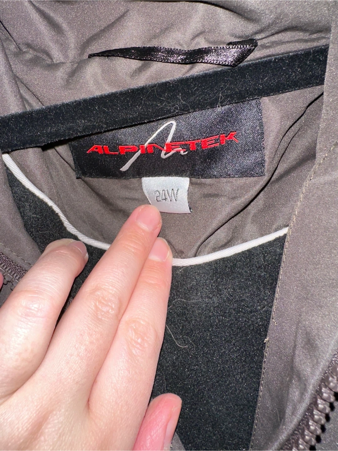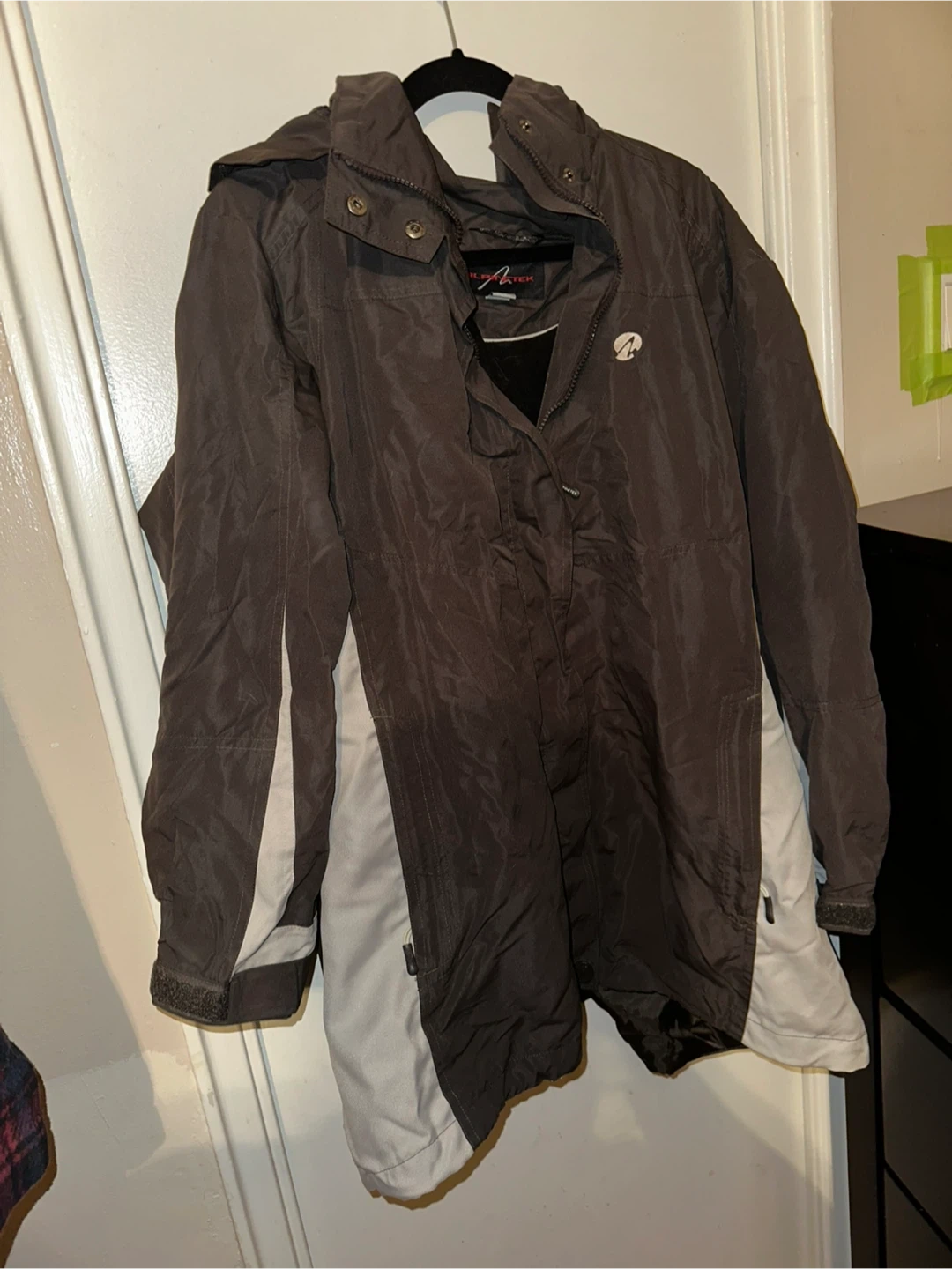 Light weight but warm (fleece interior) brown and grey woman’s jacket. This jacket would be great for travel, hiking, or camping. It’s not for winter weather unless you have layers underneath.