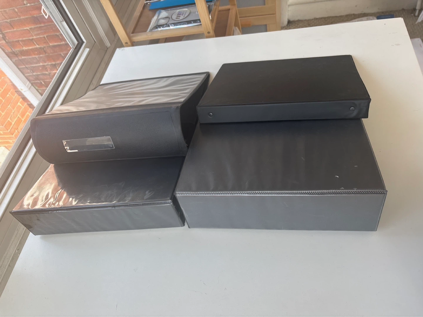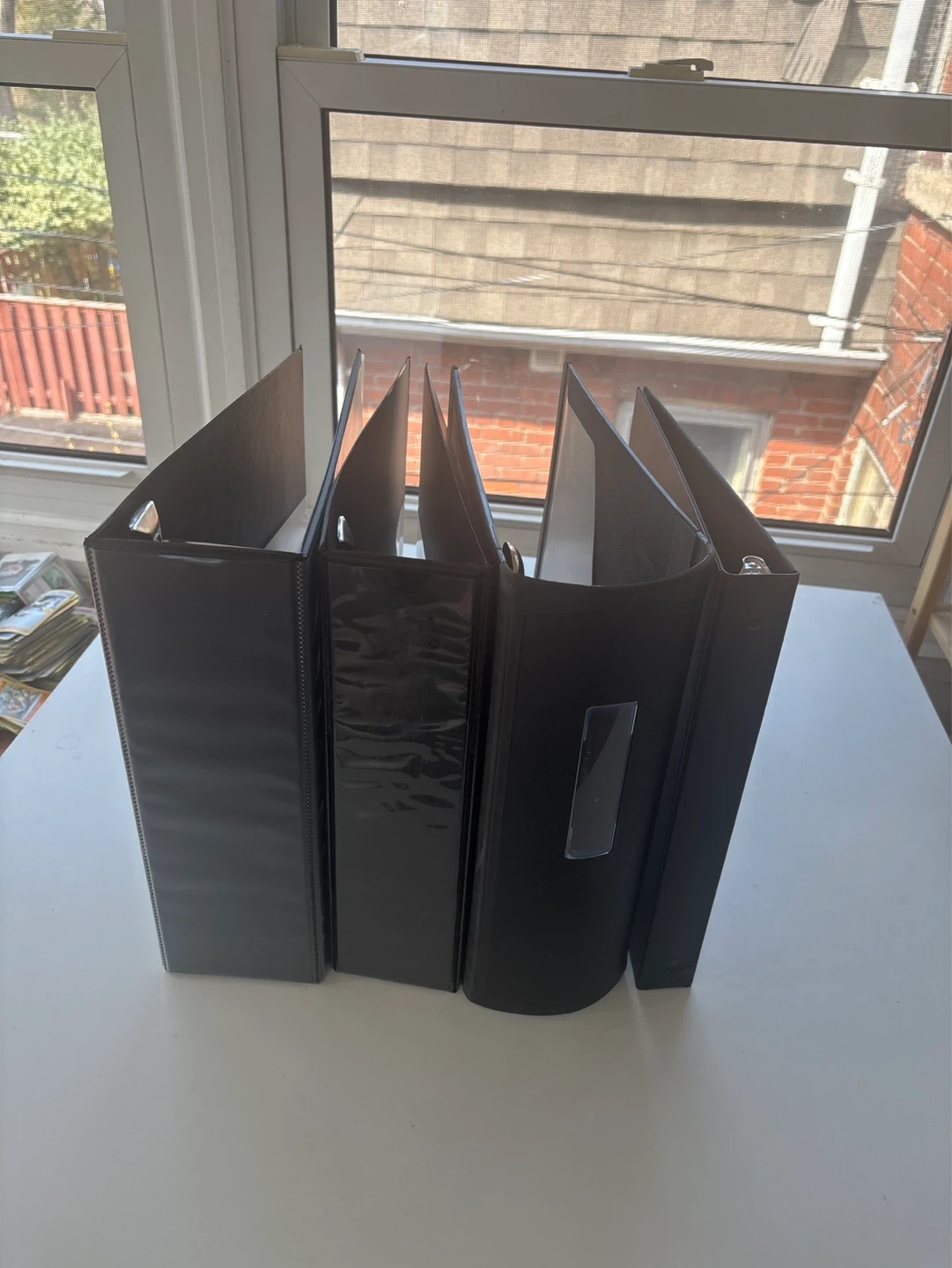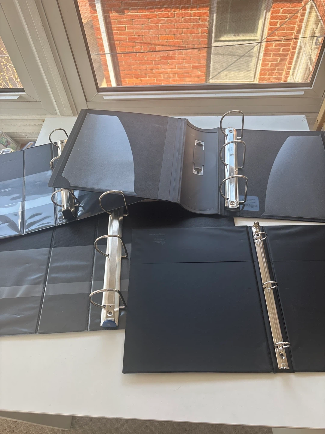 Four black binders are included. Two are 3-ring binders with 1.5-inch capacity rings. Two others are also 3-ring binders, one with clear pocket sleeves and another with a built-in label holder. They're perfect for organizing documents or photos!