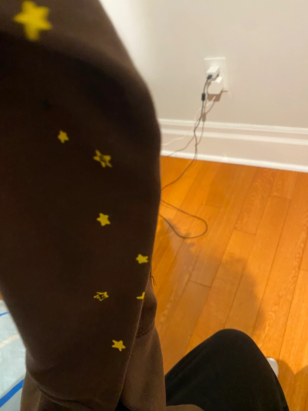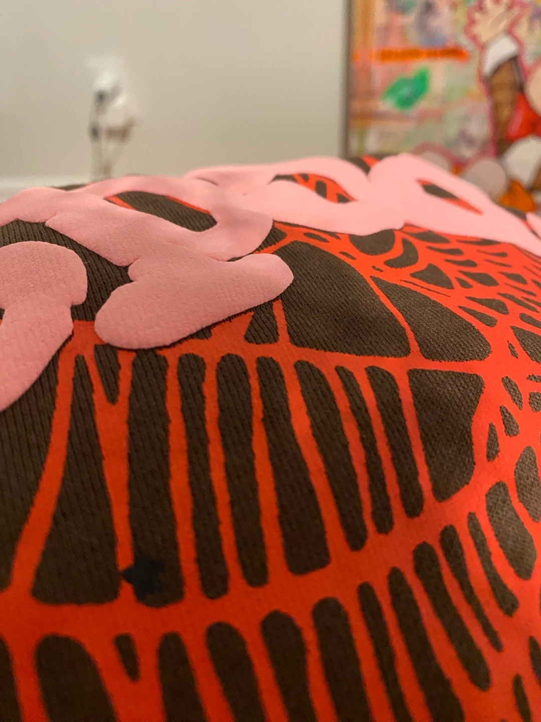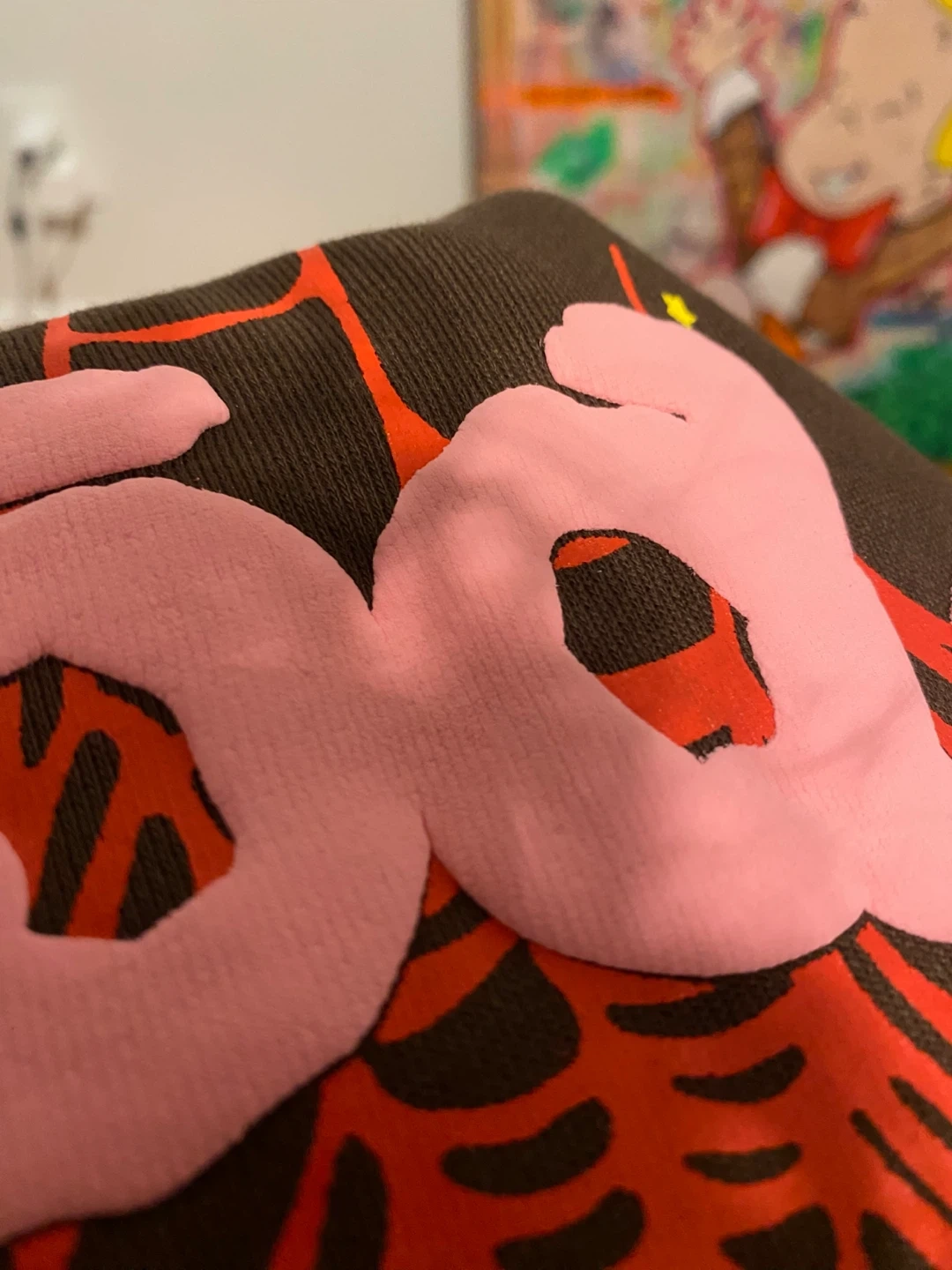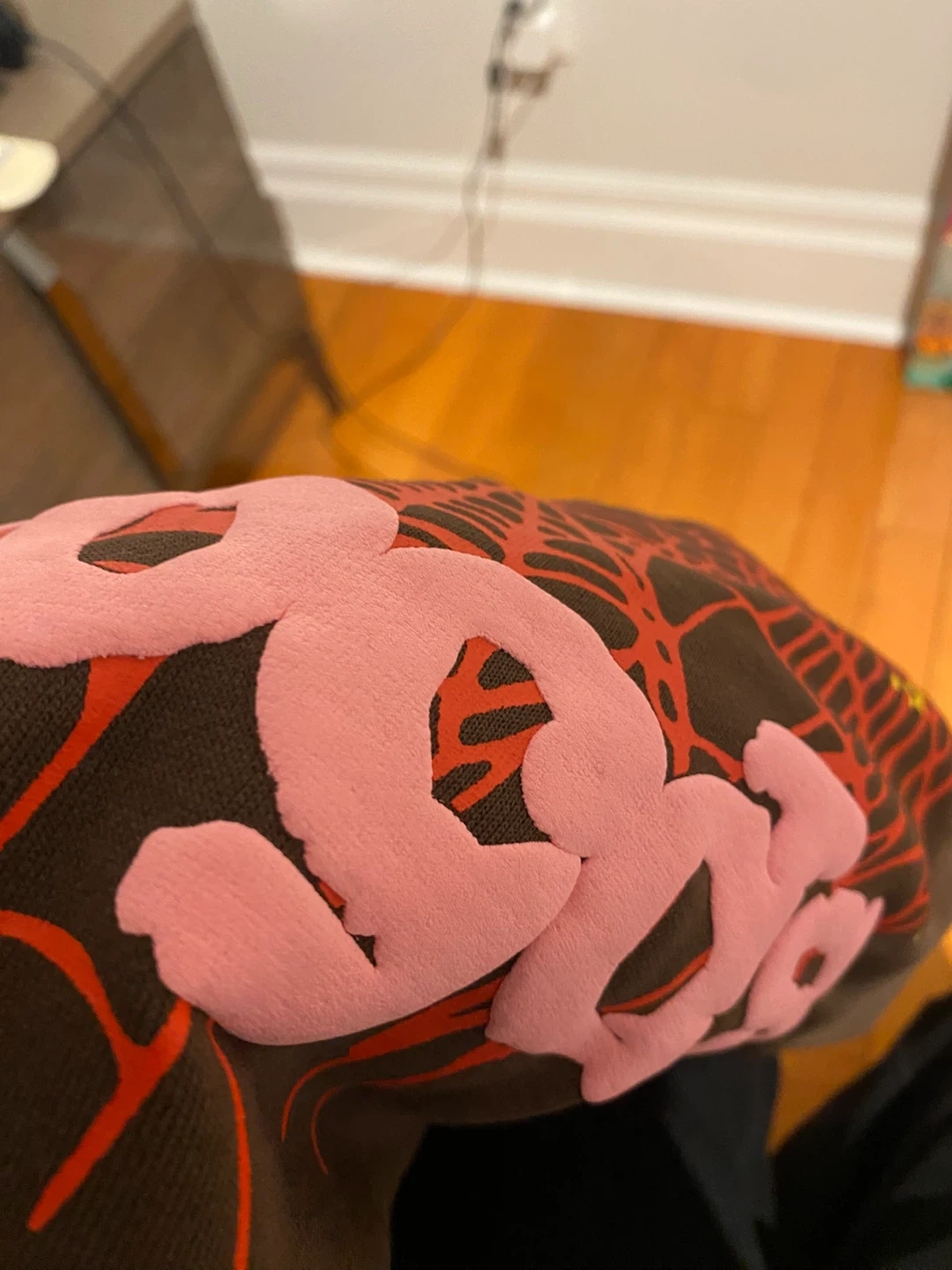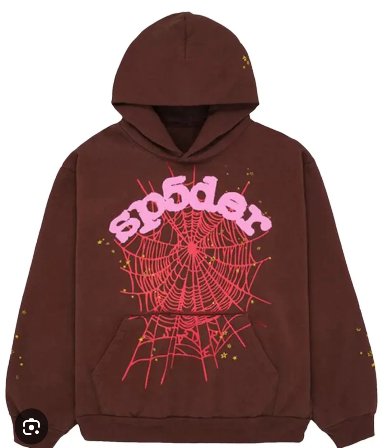 Brown hoodie with a pink spider web graphic and "sp5der" text on the front. Features yellow stars on the sleeves. Cotton material.