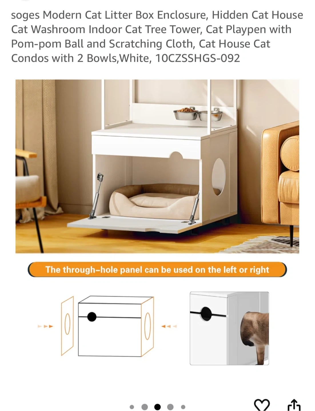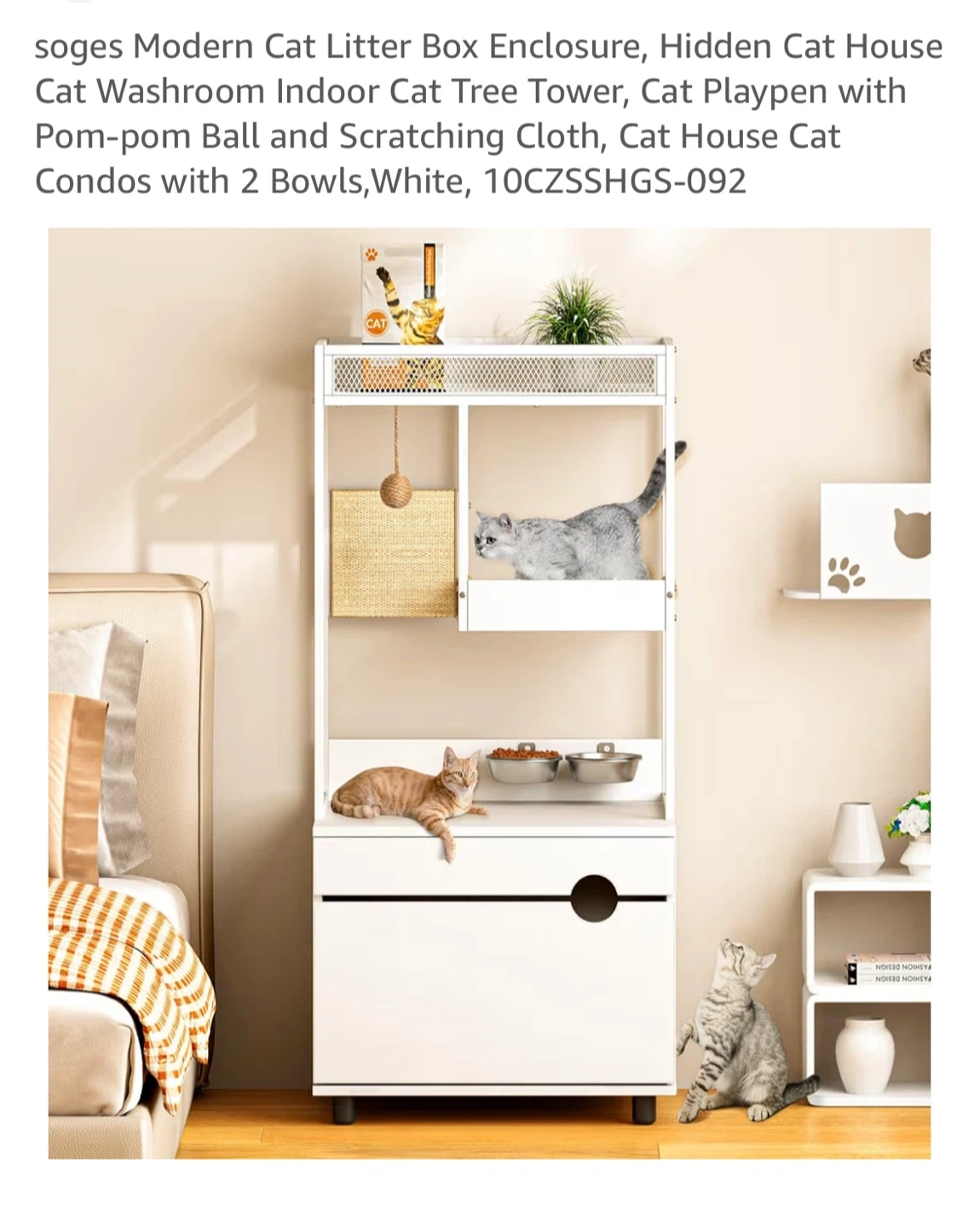 This multi-functional cat furniture includes a hidden litter box enclosure, scratching areas, and elevated perches. It's designed to keep your space tidy while providing your feline friends with a place to play and rest.