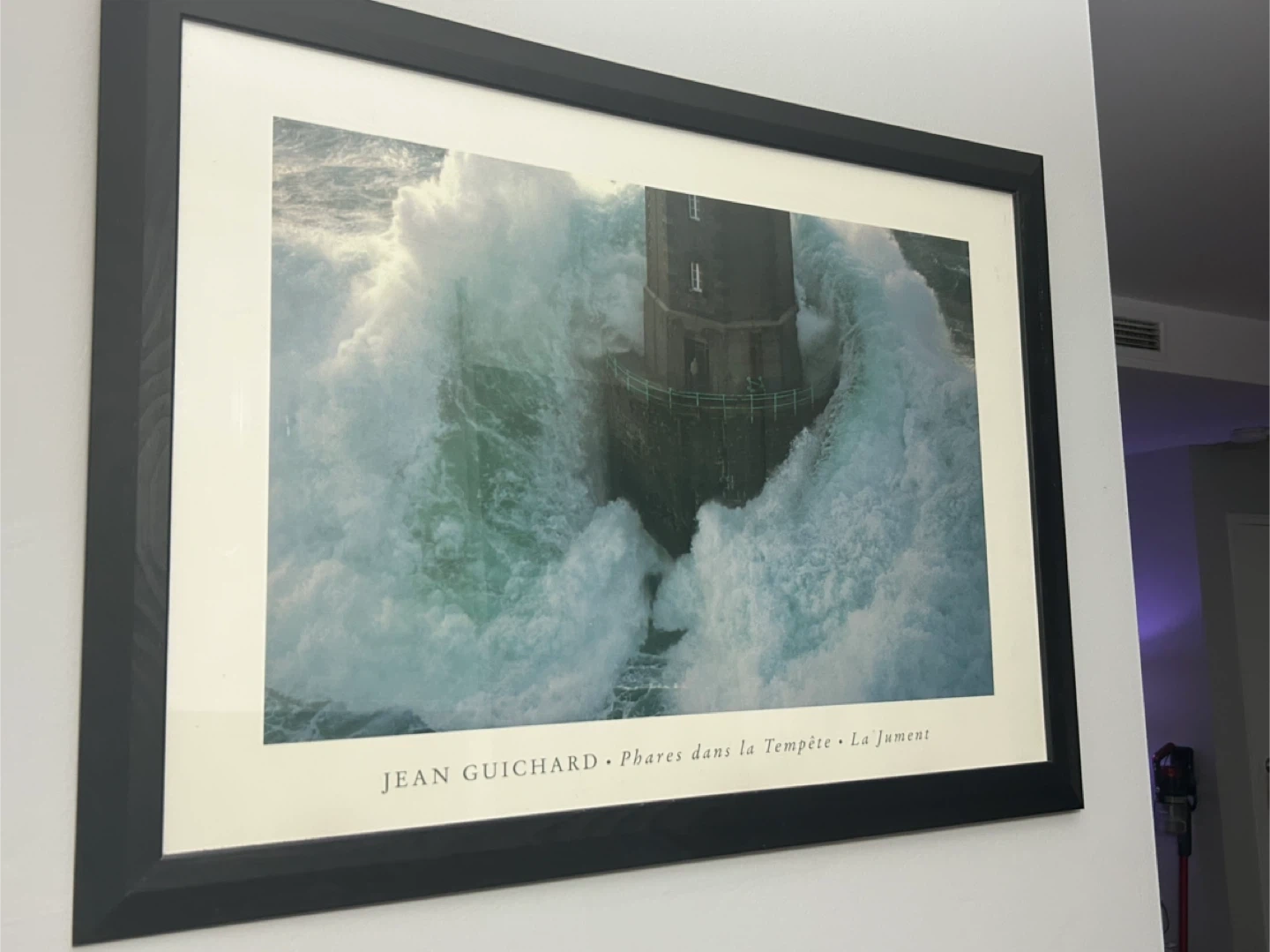 Framed art print featuring Jean Guichard's 'Phares dans la Tempête'. The artwork depicts a lighthouse battered by waves. Black frame with a cream matting. Ready to hang!