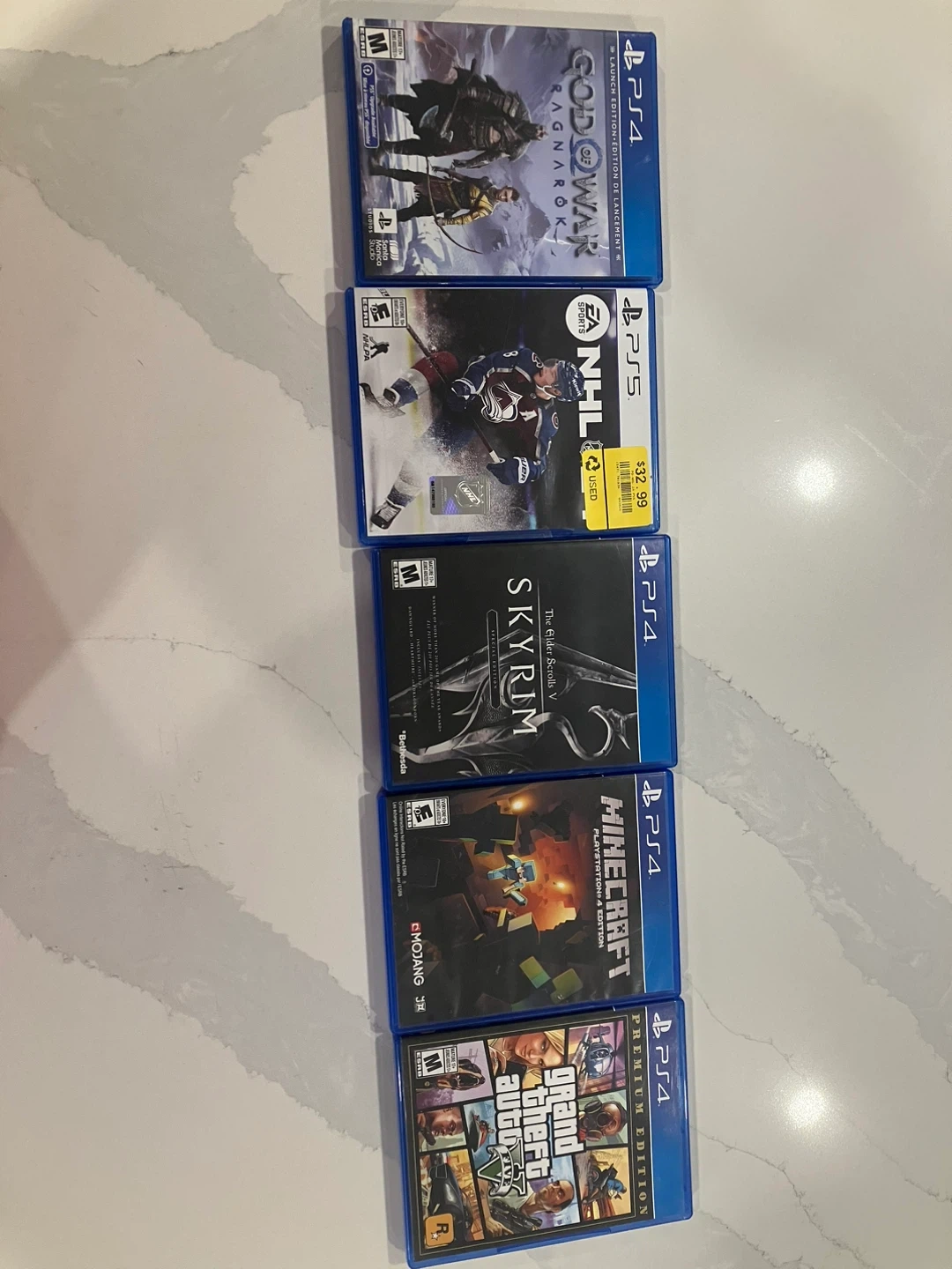 Bundle of 5 PlayStation 4 video games. Includes God of War Ragnarok, NHL 23, The Elder Scrolls V: Skyrim Special Edition, Minecraft PlayStation 4 Edition, and Grand Theft Auto V Premium Edition. All discs are for PS4.