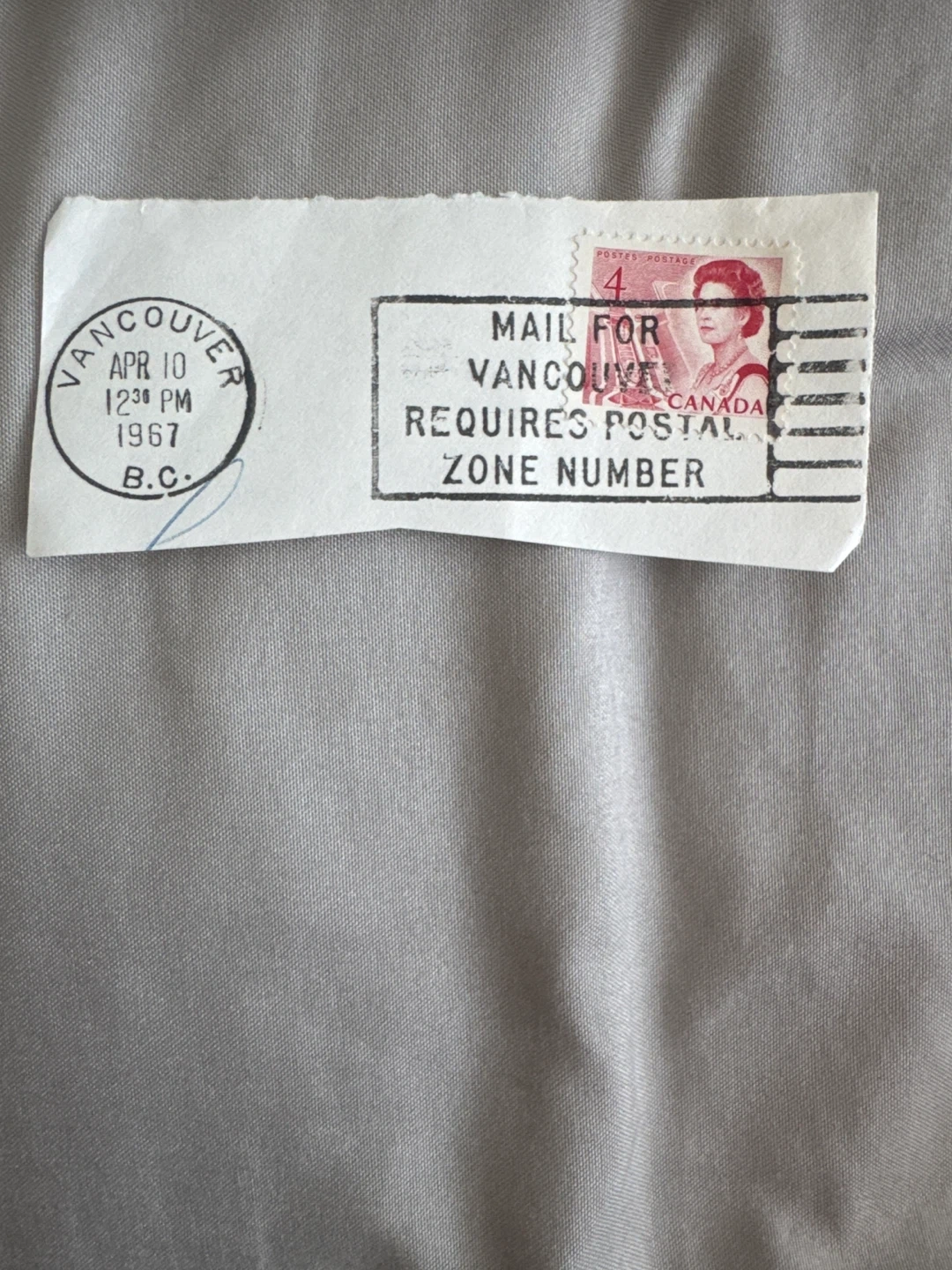 Own a piece of history- This is a vintage Canadian postage stamp from 1967 featuring Queen Elizabeth II. It also includes a postmark from Vancouver, B.C. dated April 10, 1967. The text indicates "MAIL FOR VANCOUVER REQUIRES POSTAL ZONE NUMBER". A neat piece of postal history!