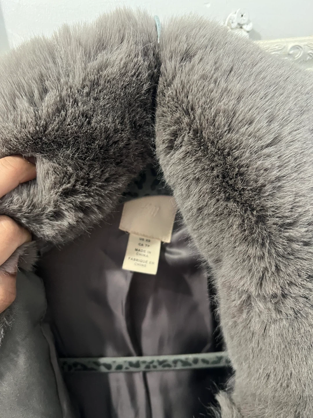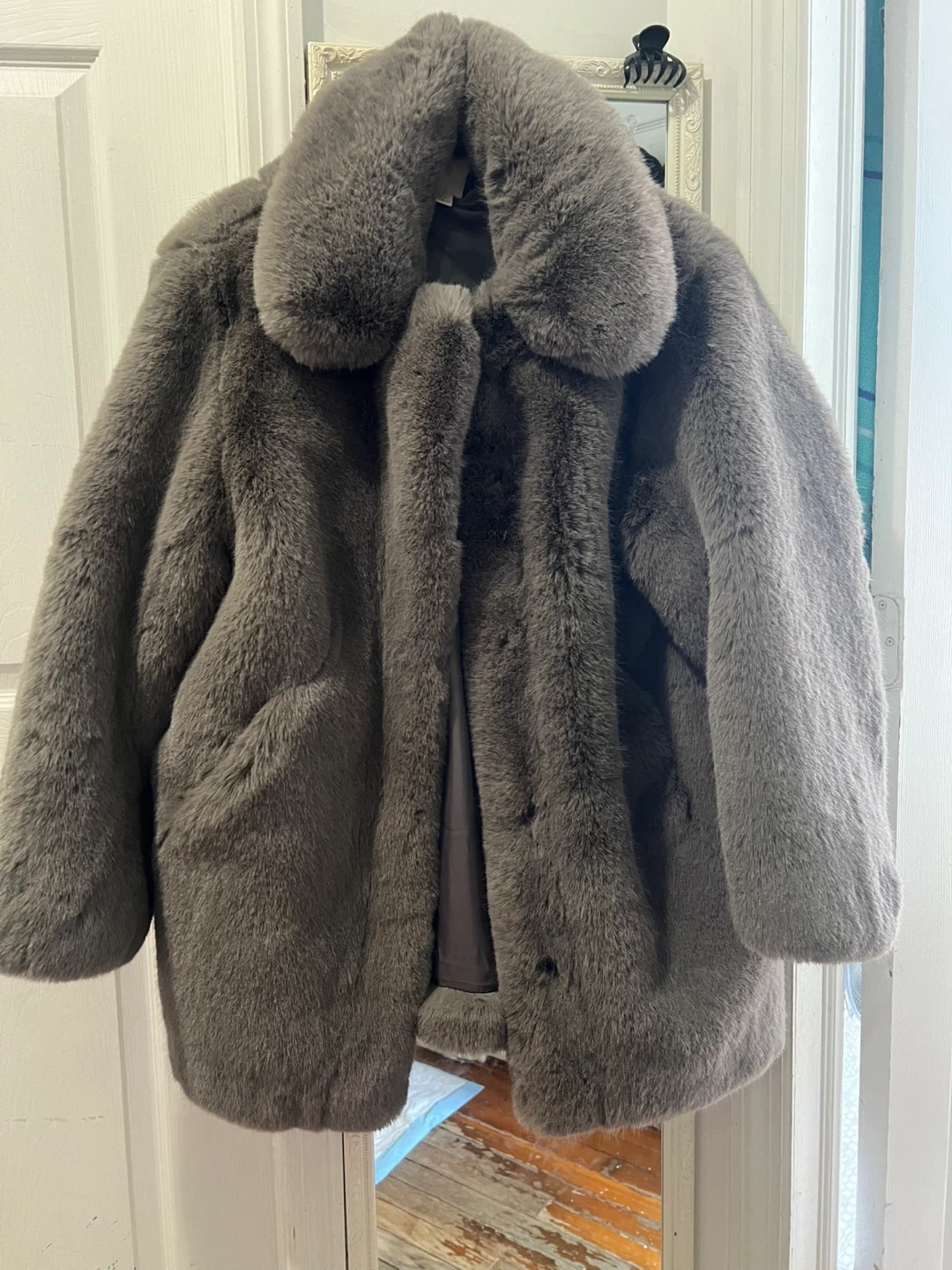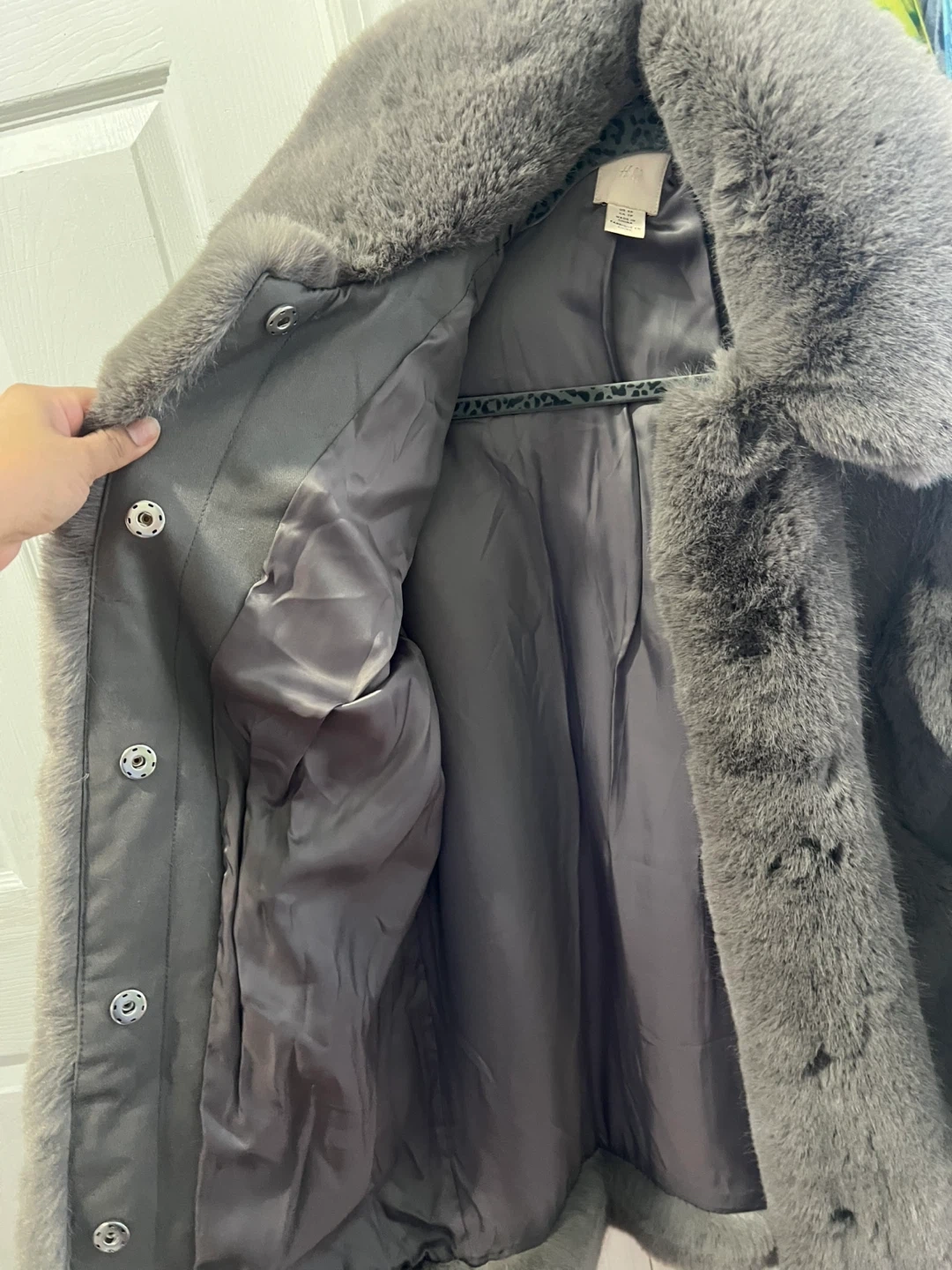 This is a warm and cozy grey faux fur coat. It features a classic collar and snap button closure. The interior has a smooth satin lining. Oversized