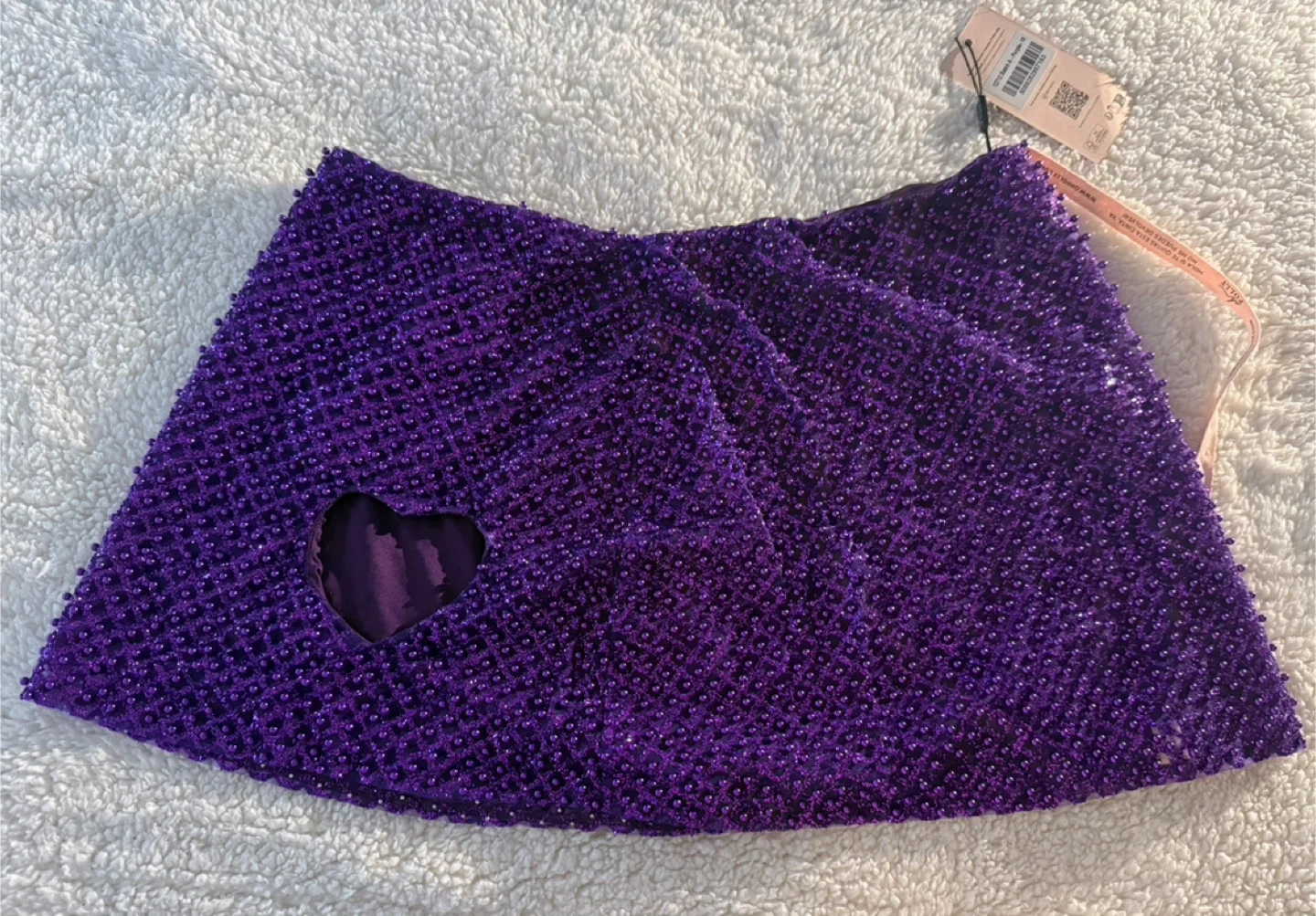 Selling a oh Polly mini skirt in purple, size 14. It features beaded detailing and a heart cutout. Perfect for a night out!