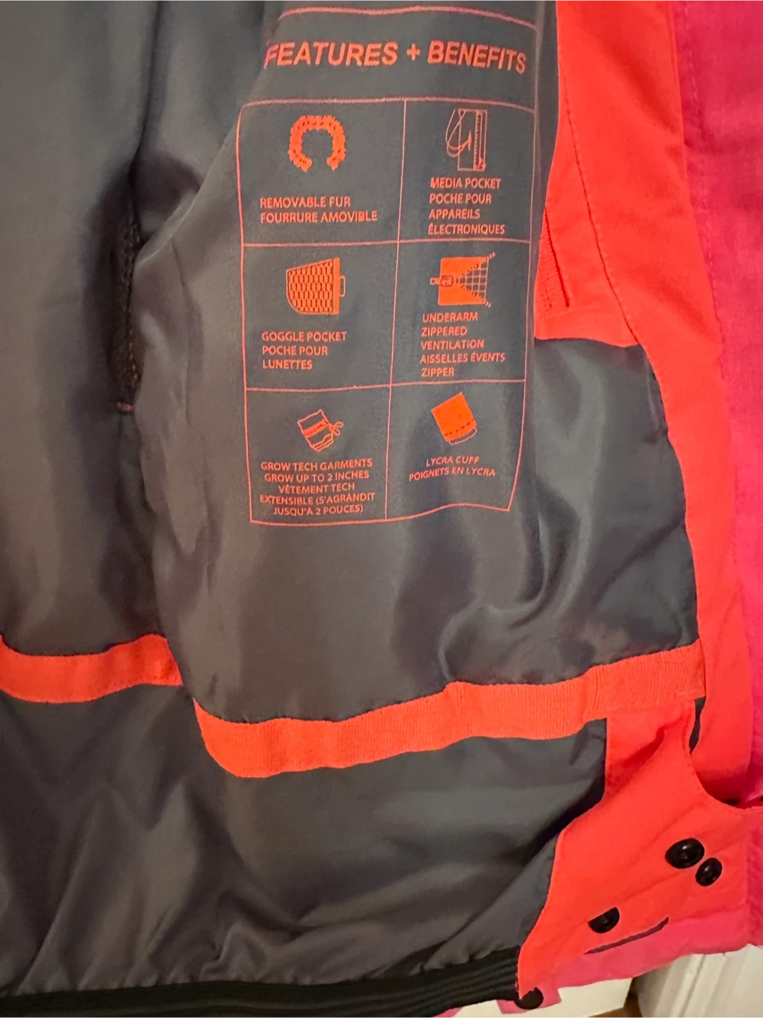 This pink Ripzone ski jacket is size L/G and features 8k waterproof and breathability ratings. It's made with grow-tech materials, allowing it to extend up to 2 inches. Includes a media pocket, goggle pocket, and underarm zippered ventilation.