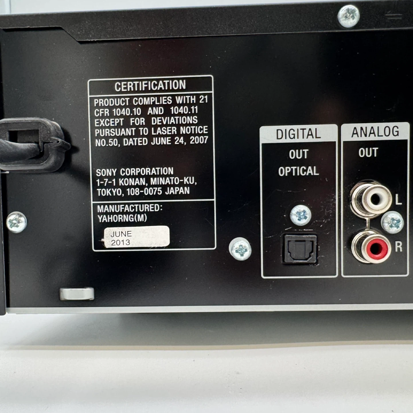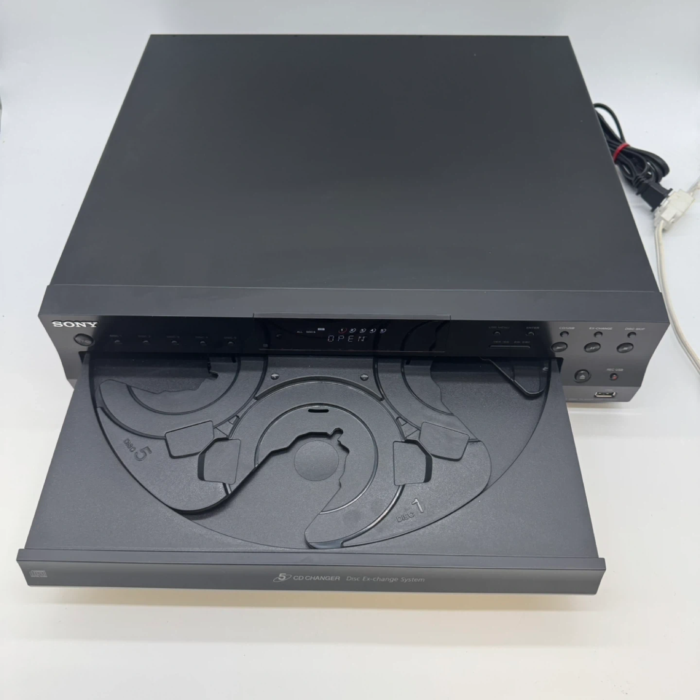 This Sony CD player features a 5-disc changer system, allowing you to load multiple CDs and switch between them easily. It also includes a USB port for playback or recording, along with analog RCA and optical digital outputs for connection to stereo systems or receivers.