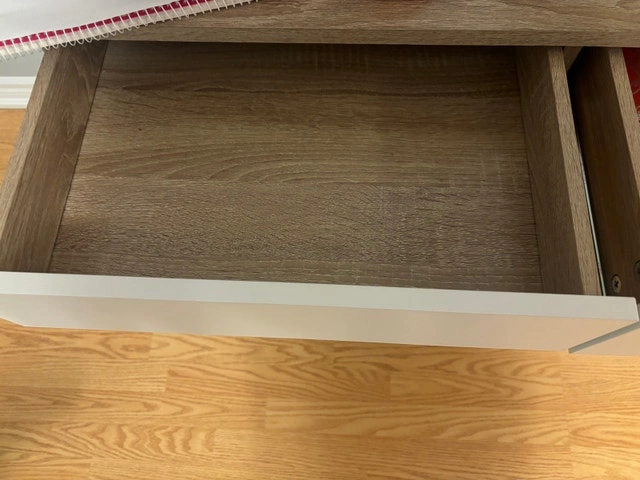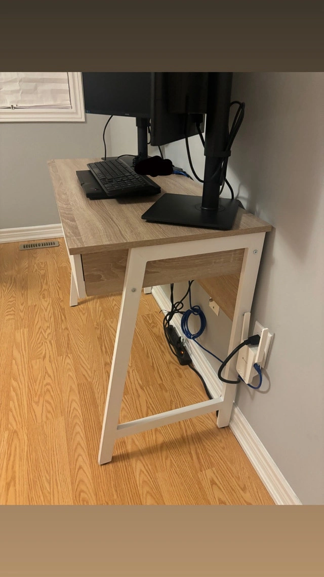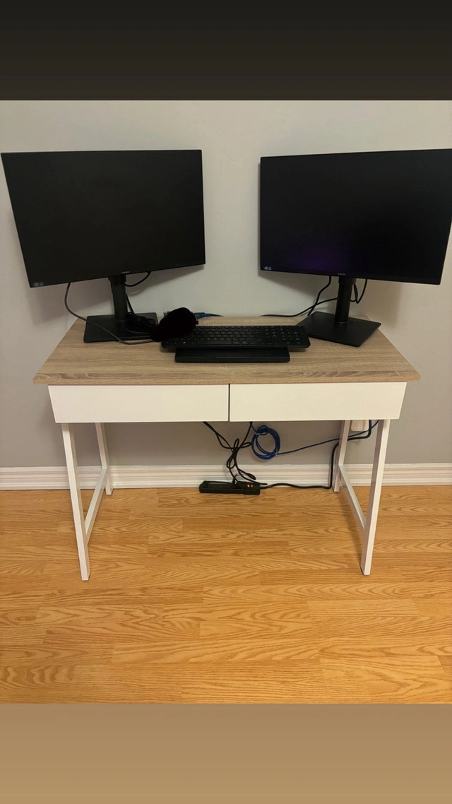 This is a Mainstays 2-Drawer computer desk, purchased from Walmart and only used for 2 months. It offers a compact and functional workspace with a tabletop that provides ample room for a laptop, monitor, books, and essentials. It also features 2 storage drawers to keep supplies neatly organized and an integrated USB charger to easily charge your devices.