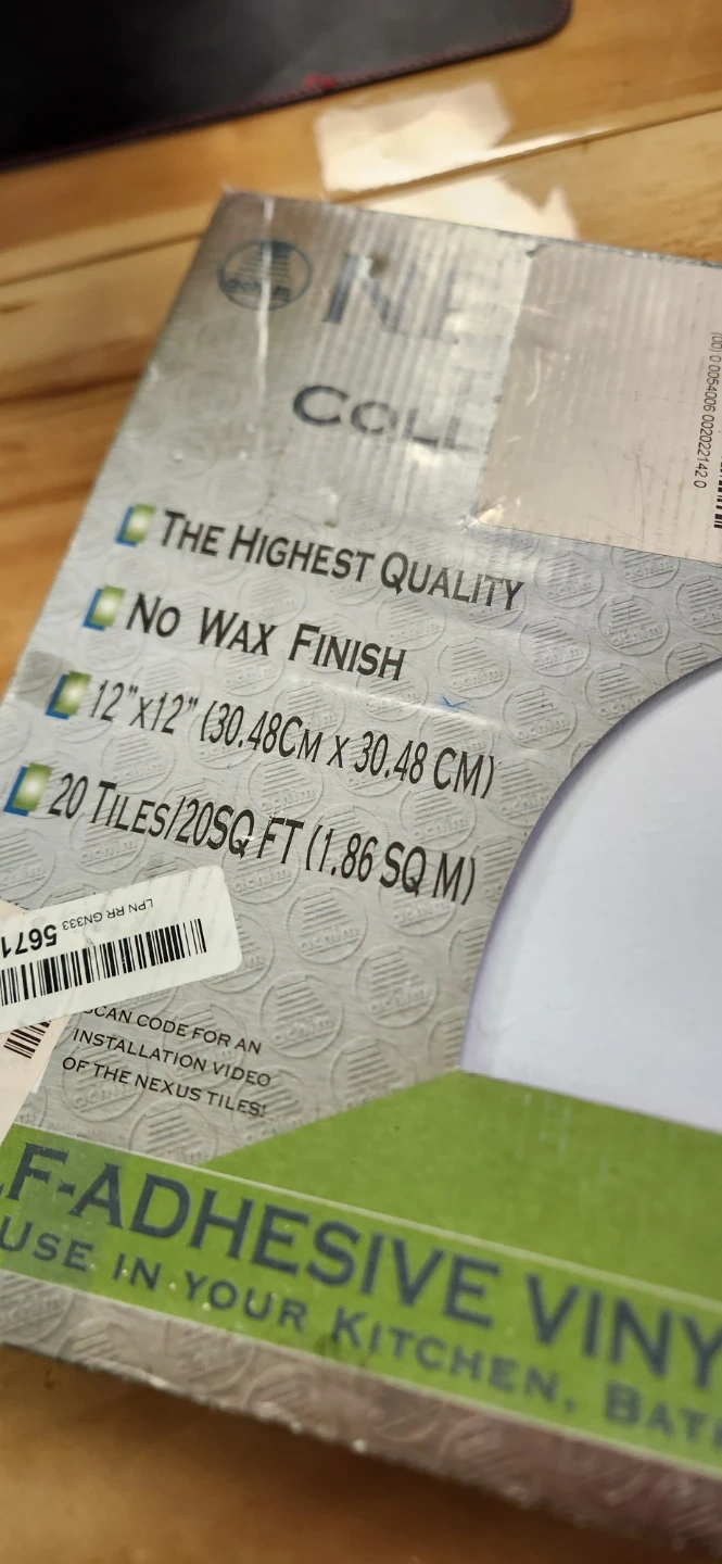 Nifty Nexus Collection self-adhesive vinyl tiles. Each tile is 12"x12" (30.48cm x 30.48cm). Box contains 20 tiles, covering 20 sq ft (1.86 sq m). They have no wax finish and are the highest quality. These are great for refreshing your kitchen or bathroom!
