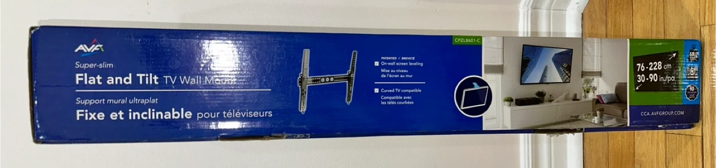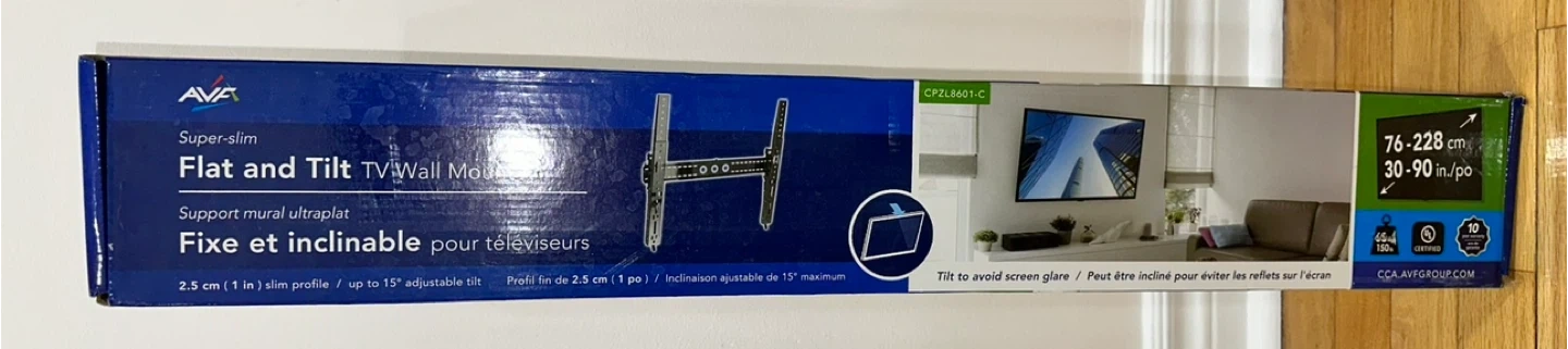 This is an AVA Super-slim Flat and Tilt TV Wall Mount. Supports TVs from 76-228 cm (30-90 inches). It's compatible with VESA TV fixings up to 800 x 400 mm and has a slim profile of 2.5 cm (1 inch) with up to 15Β° adjustable tilt. Includes hardware for wood studs and solid walls.