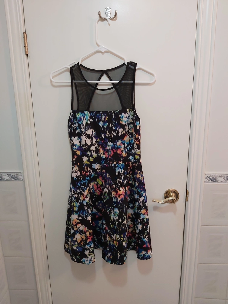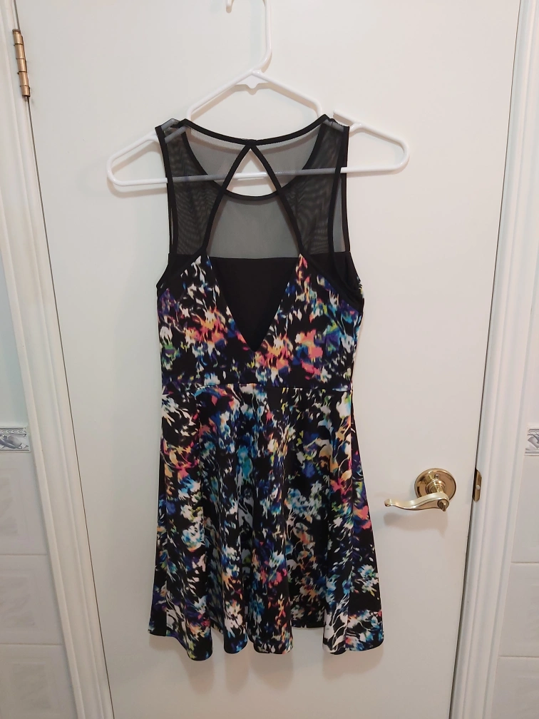 Type: Skater type dress with sheer portion near the chest/neckline area, and a beautiful V lined back