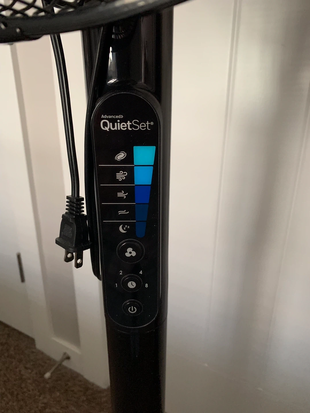 This is a black Honeywell QuietSet pedestal fan. It features multiple speed settings and a timer function. The fan's height is adjustable for personalized comfort.