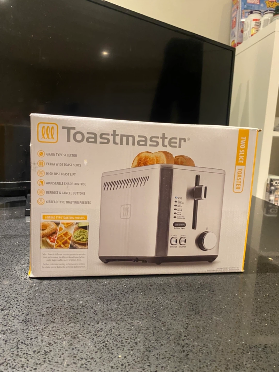 Brand new Toastmaster 2-slice toaster still in the original box. Features extra-wide slots, adjustable shade control, and multiple bread type settings for perfect toast every time. Also includes defrost and cancel buttons for convenience.