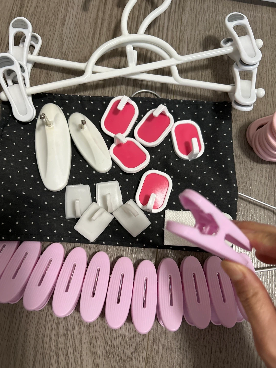 An assorted white adhesive hooks, pink clothespins, and 3M Command strips.