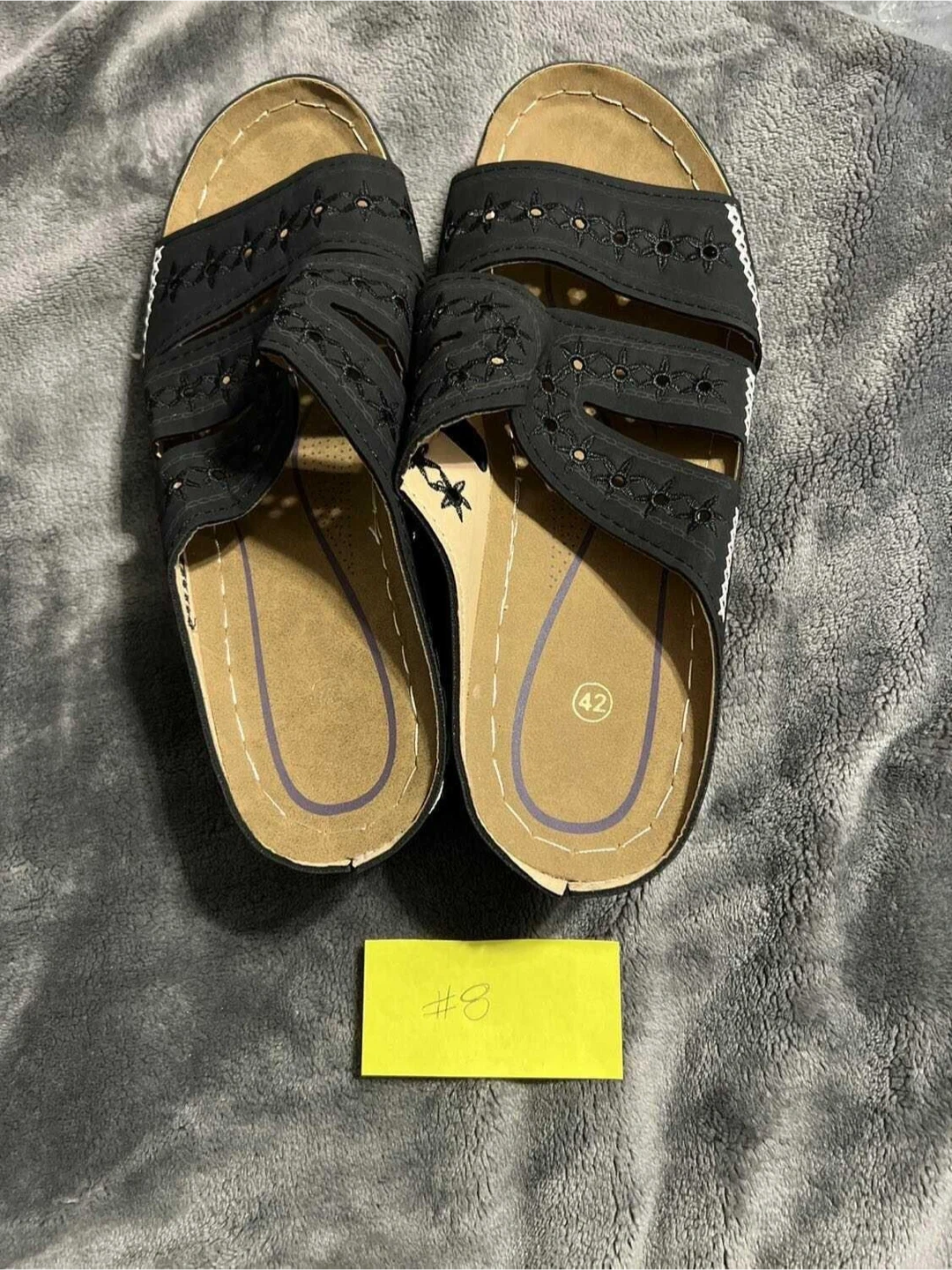 Size 9 (42) Comfortable black women's sandals with a decorative laser-cut pattern. Features a cushioned footbed and a durable sole. Still in original packaging taken out only for photos.