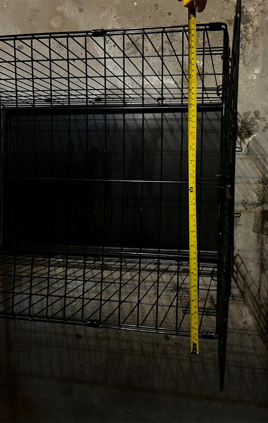 This is a black metal dog crate with a plastic tray .The crate is foldable for easy storage and transport. It's suitable for training or travel.