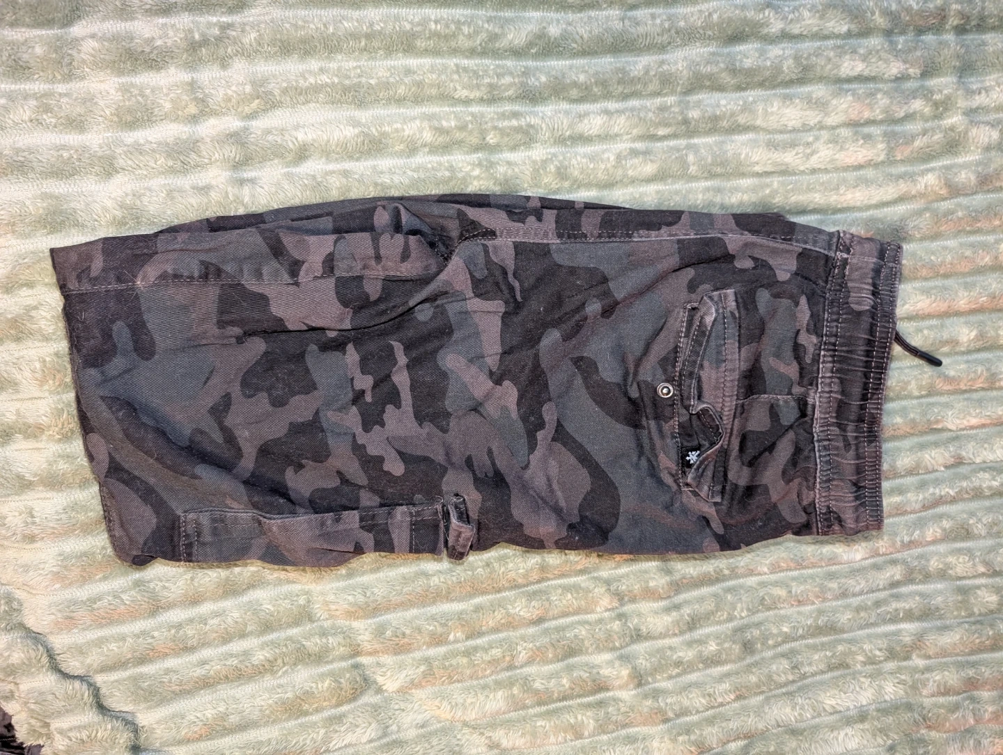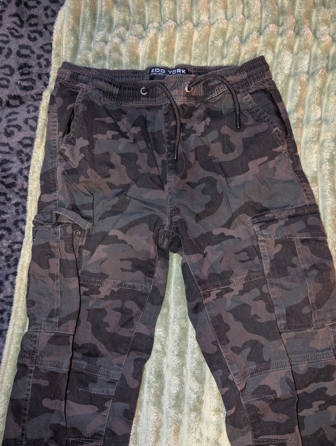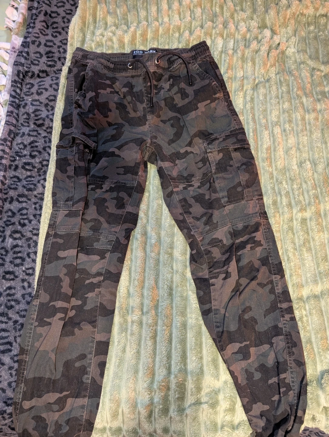 Selling a pair of Zoo York cargo pants in a cool camouflage pattern! They have a comfortable elastic waistband with a drawstring. Great for a casual, streetwear look. Size 15/16 in youth sizes.