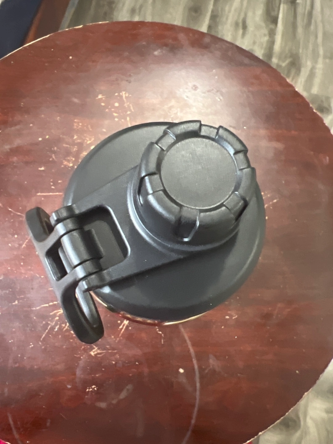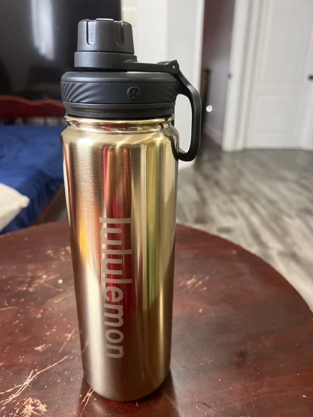 Gold stainless steel water bottle. Features a black lid and carrying handle. Lululemon logo engraved on bottle.