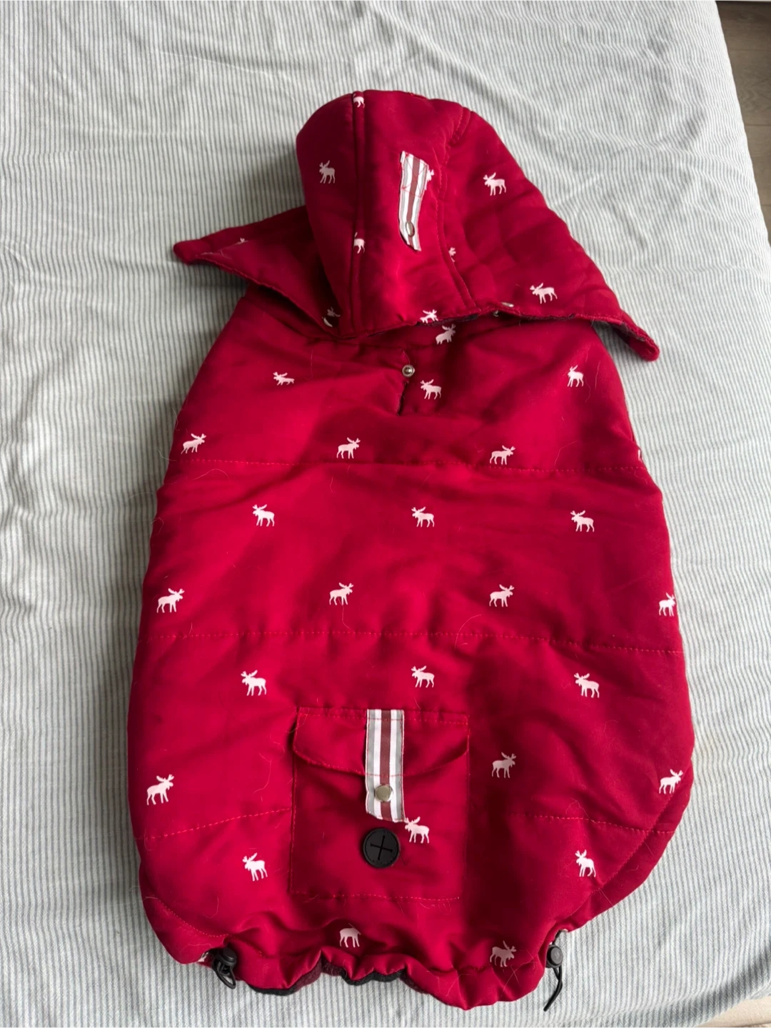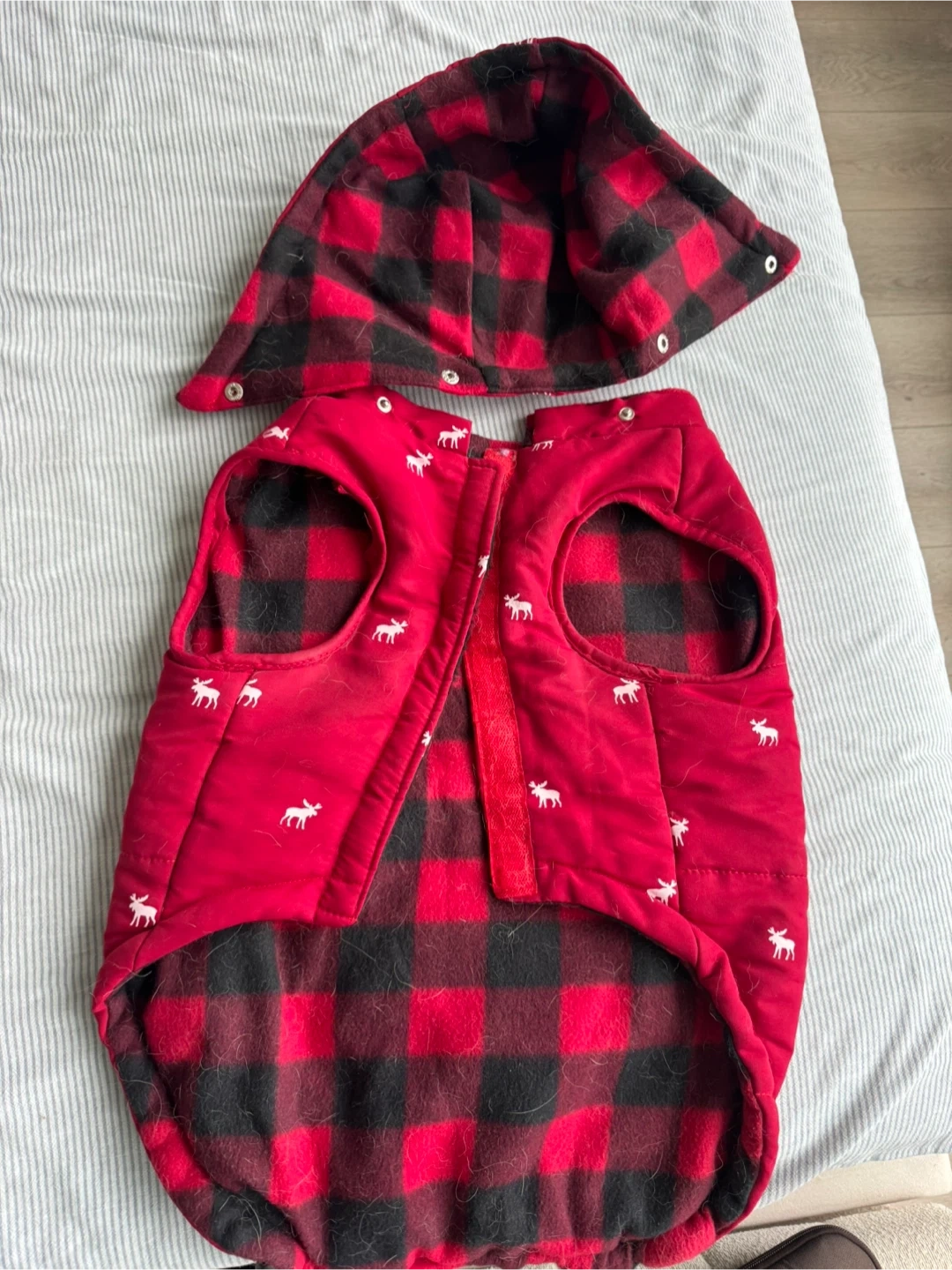 This cute dog jacket is red with a white moose pattern all over. It features a cozy plaid lining and a hood. It's perfect for keeping your furry friend warm on chilly days!