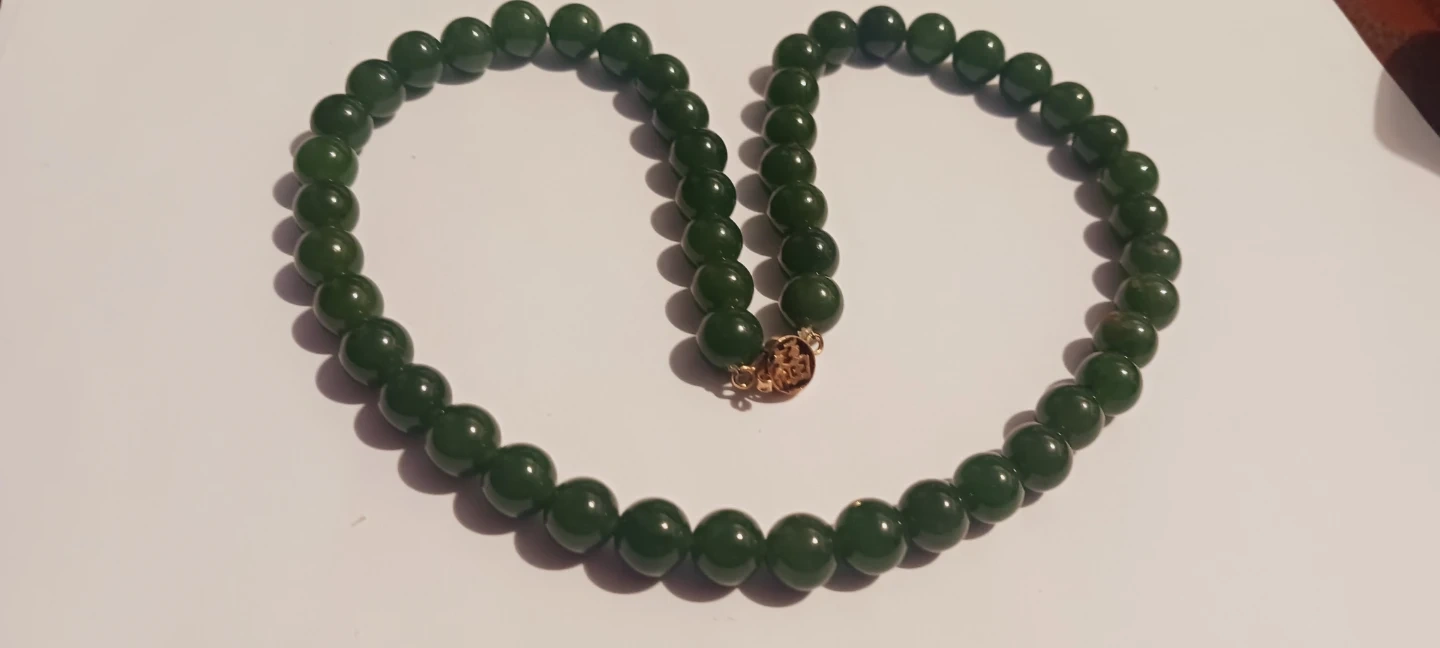 14 KARAT GOLD CLASP STAMPED GENUINE CHINESE JADE NECKLACE. 15" LONG. EXCELLENT CONDITION. ALL MY PRICES ARE NEGOTIABLE !!