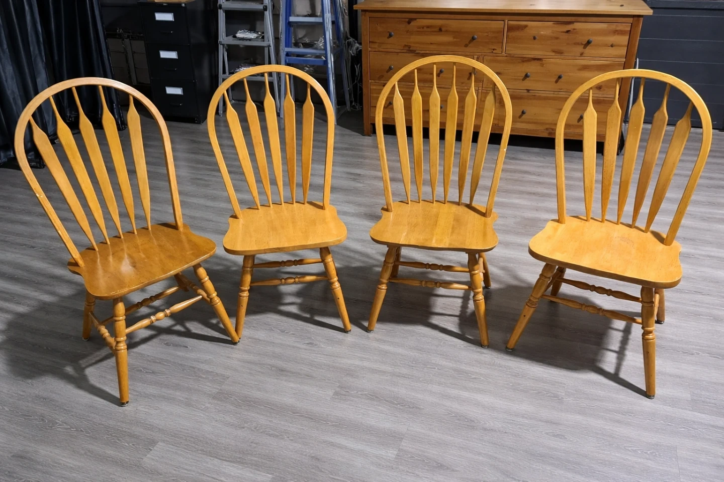Set of four light wood dining chairs. These chairs feature a classic spindle-back design. Perfect for a kitchen or dining room! They're made of solid wood.