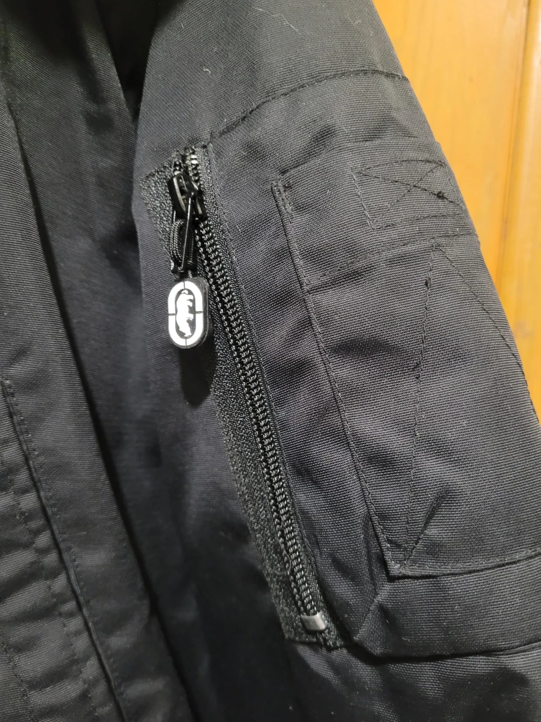 This is a black Ecko Red puffer jacket. It's a size X-Large and made with 100% nylon. It features a faux fur-lined hood. Perfect for keeping warm!