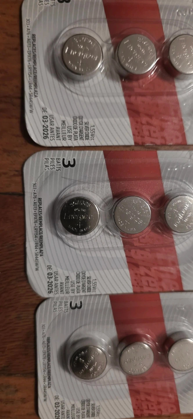 Energizer 357 watch batteries. Each pack contains 3 batteries. These are silver oxide button cell batteries. Use by date is 03-2026.