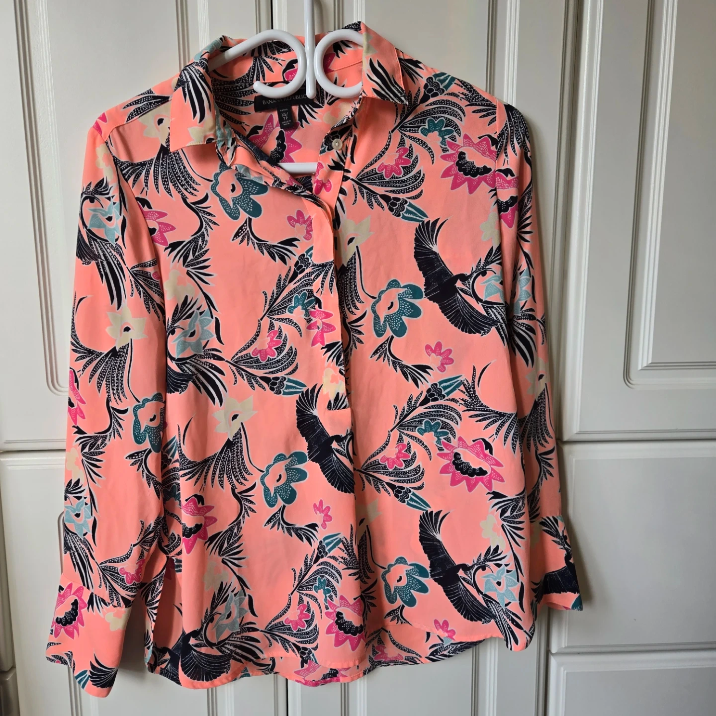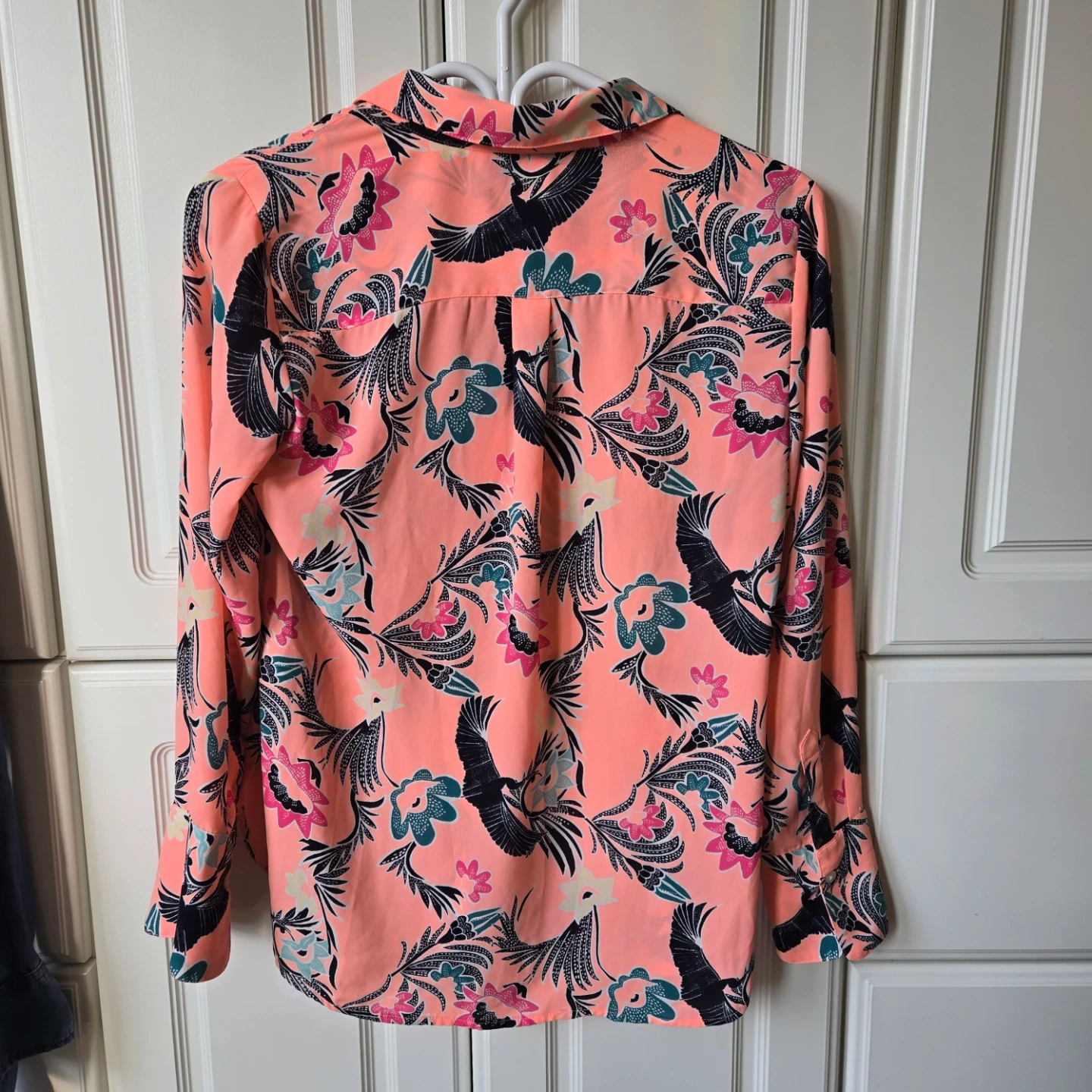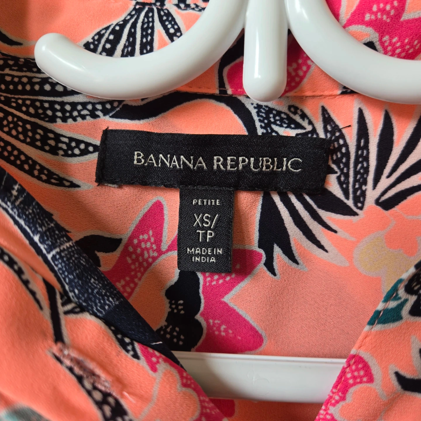 This Banana Republic blouse comes in a petite size XS. It's made of 100% polyester and features a vibrant floral and bird print. The button-up style is perfect for adding a pop of colour to any outfit!