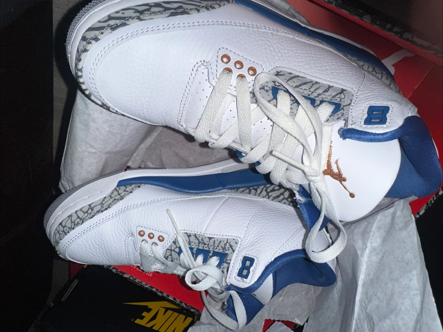 Classic Air Jordan 3 Retro sneakers in white, blue, and grey. Includes original box. Leather and elephant print details.