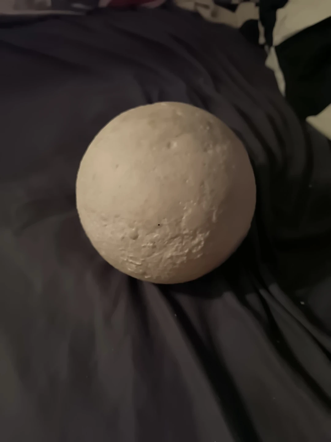 This decorative sphere resembles the surface of the moon. It has a textured, light grey finish. It's a unique piece for display. Has 3 different light modes (white, light pink, orange) does not come with stand or Usb-a charger