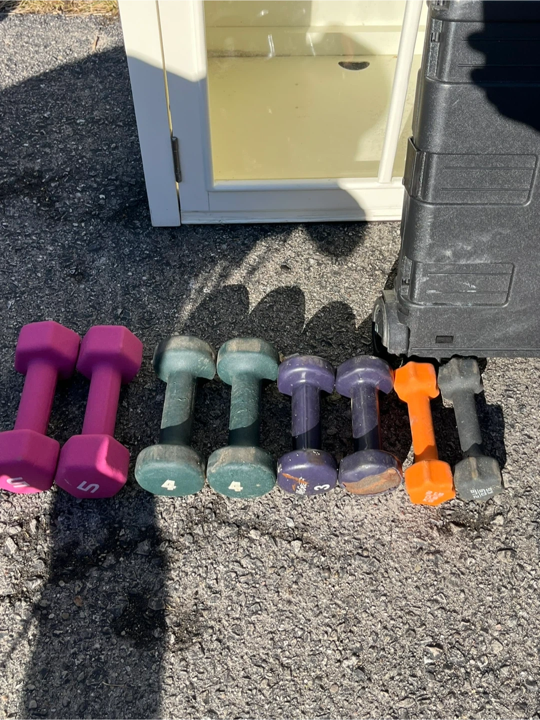 This set includes 8 dumbbells. Weights visible are 5 lbs, 5 lbs, 4 lbs, 4 lbs, 3 lbs, 3 lbs, and two unreadable weights. They're great for home workouts!