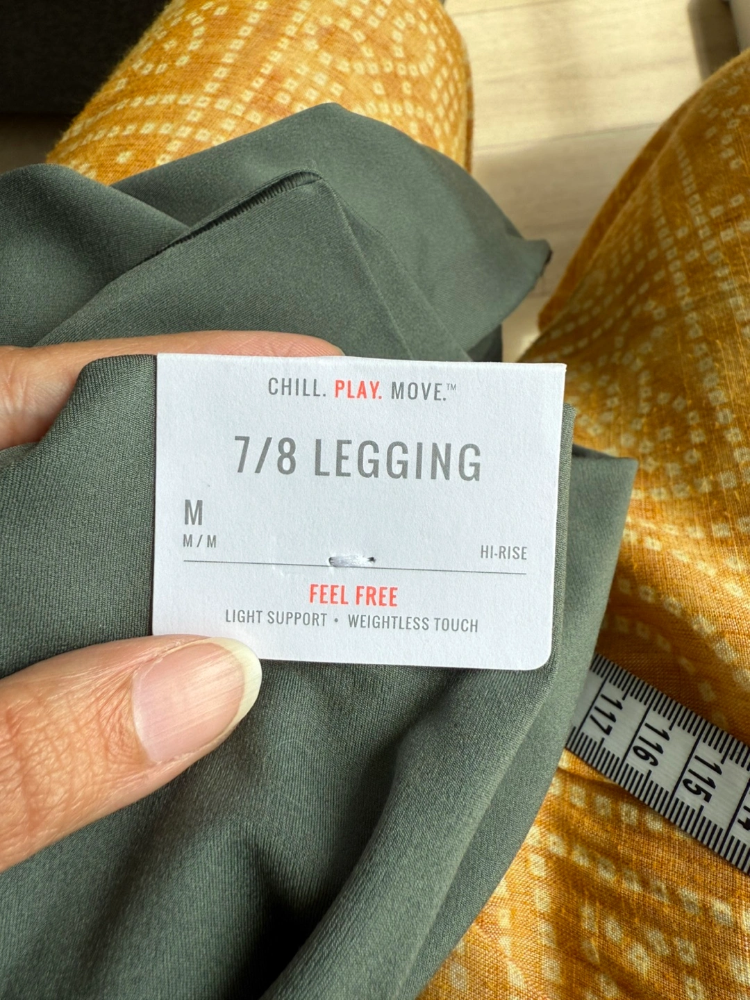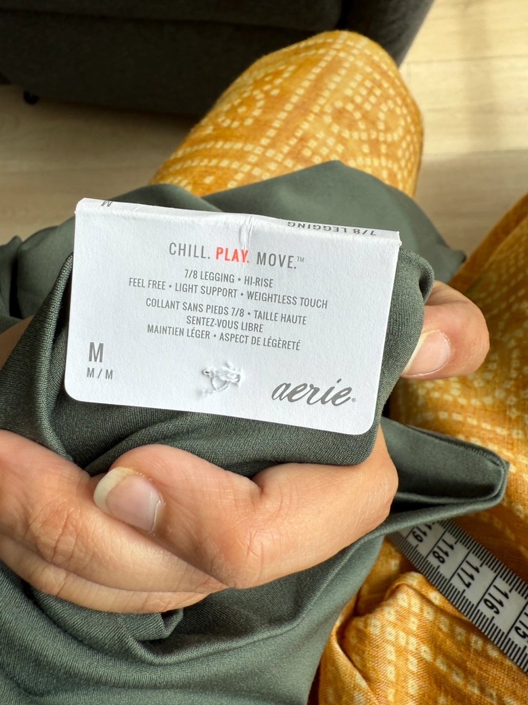 Snug and stylish Aerie Chill. Play. Move 7/8 Leggings. These leggings are a size medium and feature a high-rise design. They're made with a light support and weightless touch, perfect for any activity!