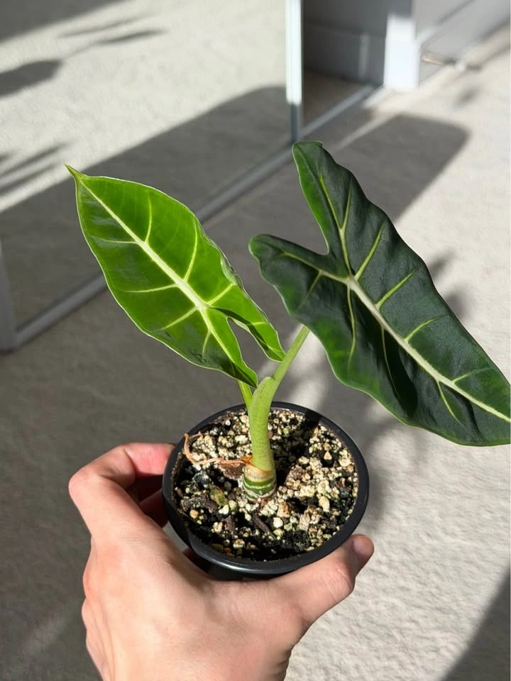 This is one of the easiest Alocasias to care for! It’s well-rooted, healthy, and loves bright, indirect light. Water when the top inch of soil feels dry.