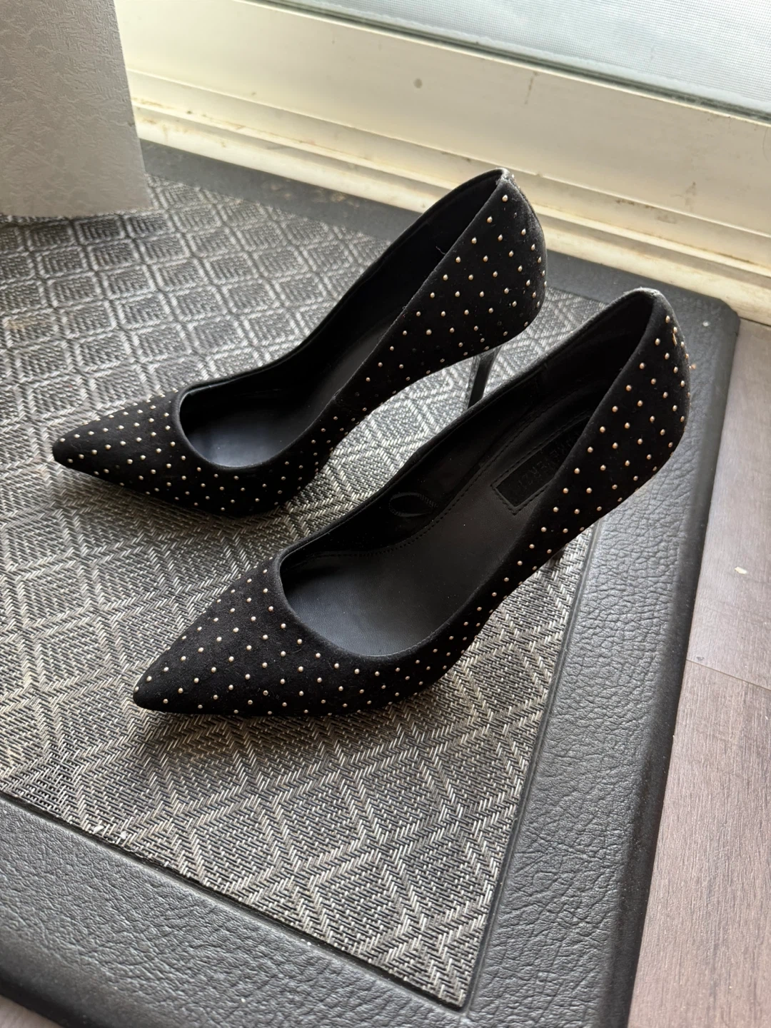 These black high heel pumps are detailed with gold-tone studs. They feature a pointed toe and stiletto heel. Size 6 US