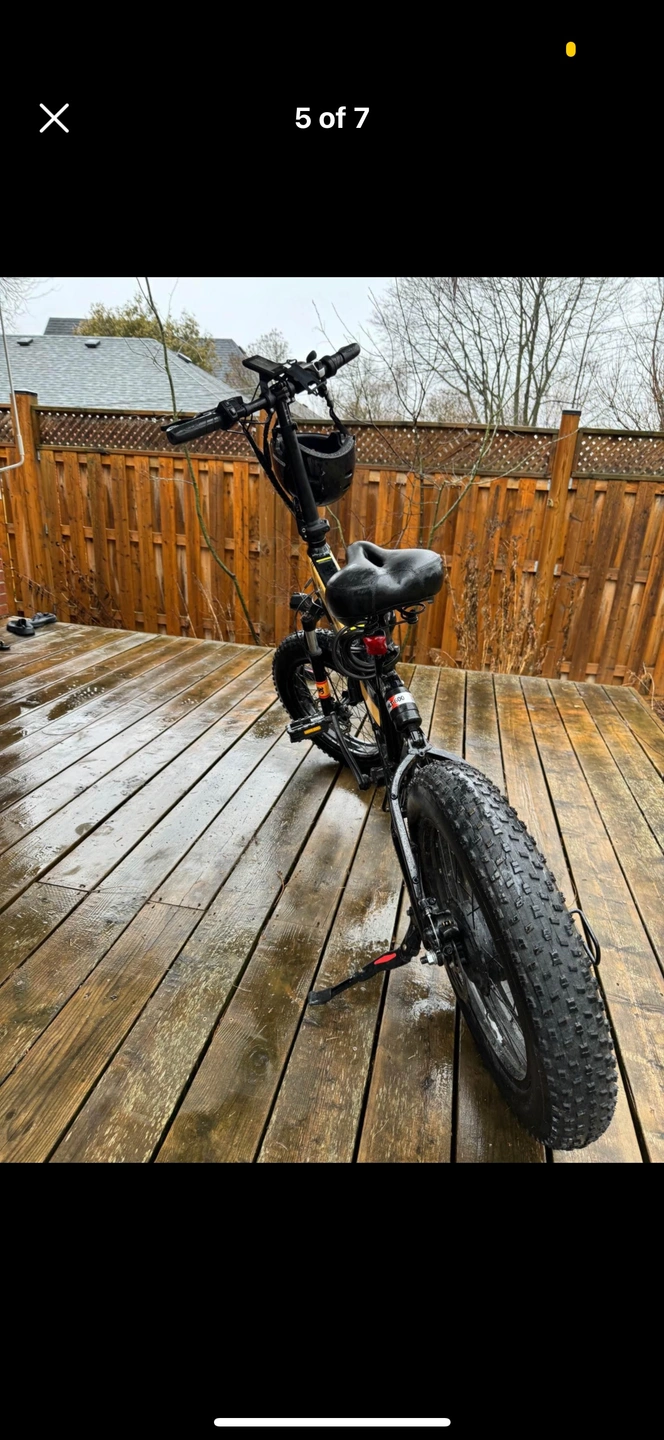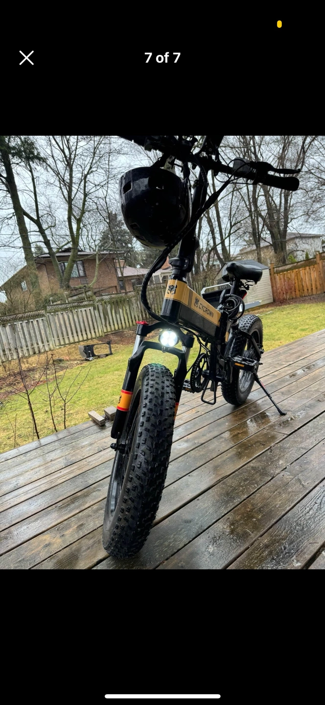 Black and gold electric bike with fat tires. Includes a helmet. The bike is in good condition. The battery is functional. The bike comes with a charger. The bike has front and rear lights. The bike has a kickstand. The bike has a bell. The bike has a rear rack. The bike folds. The bike is ready to ride. The bike is a great way to get around town. The bike is also great for off-roading. The bike is easy to assemble. The bike is easy to use. The bike is a lot of fun. The bike is a great investment. The bike is a great way to get some exercise. The bike is a great way to save money on gas. The bike is a great way to be environmentally friendly. The bike is a great way to reduce your carbon footprint. The bike is a great way to get out and enjoy the fresh air. The bike is a great way to meet new people. The bike is a great way to explore your city. The bike is a great way to go on adventures. The bike is a great way to make new memories.