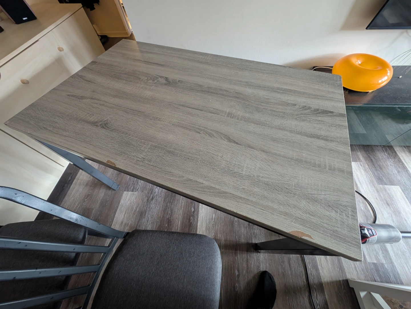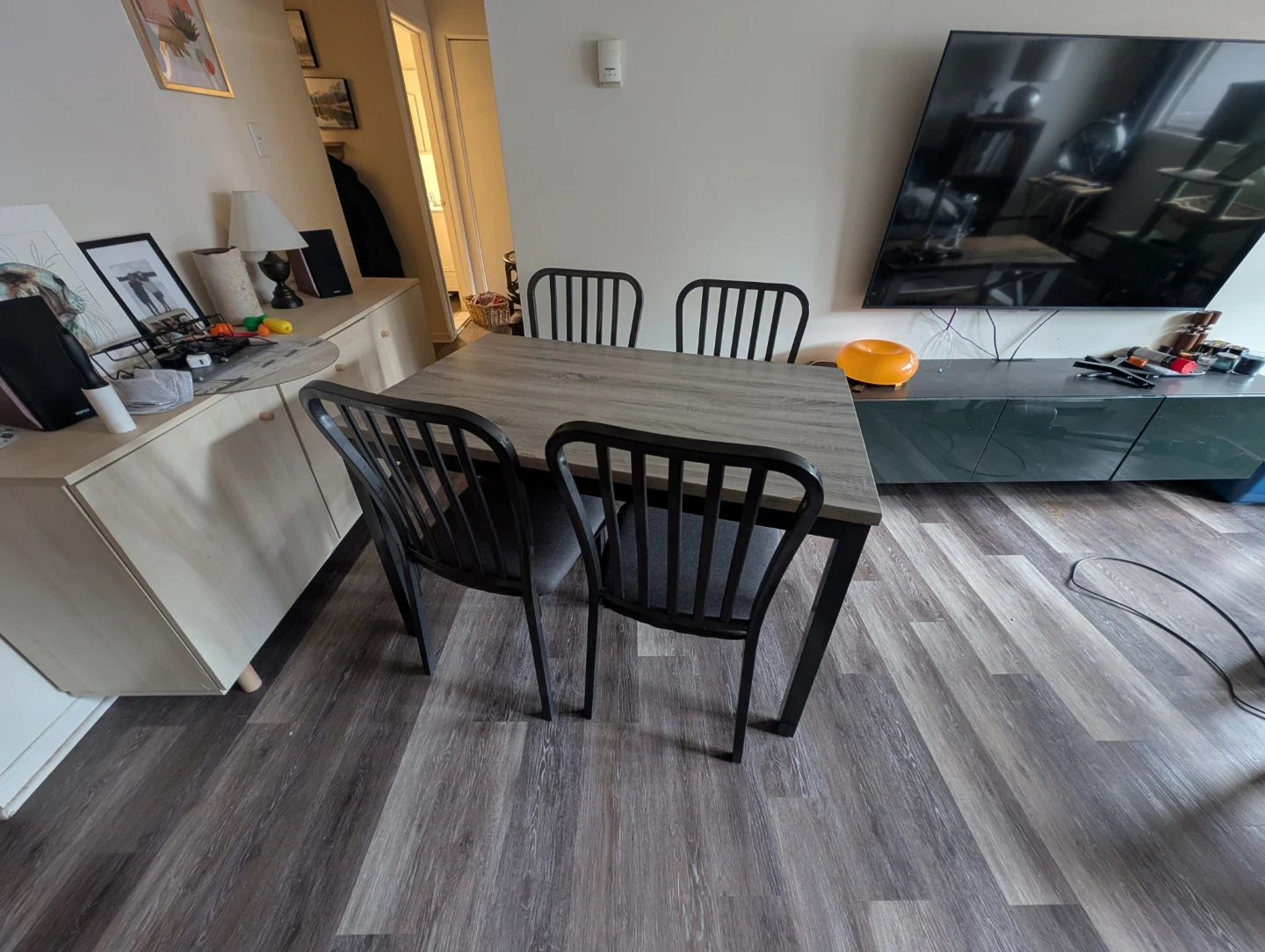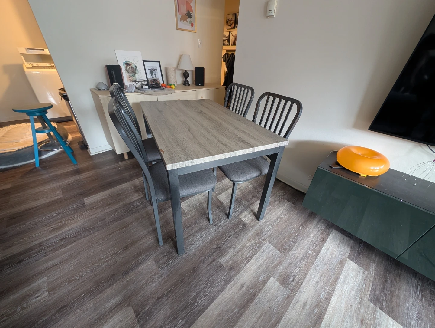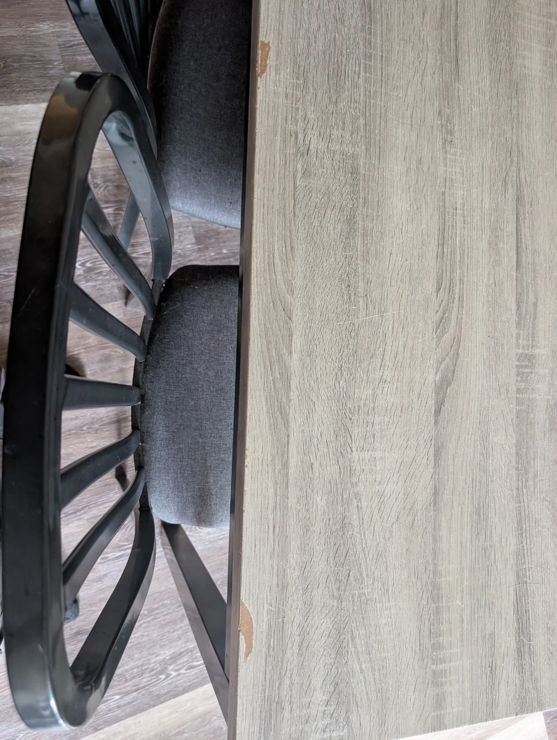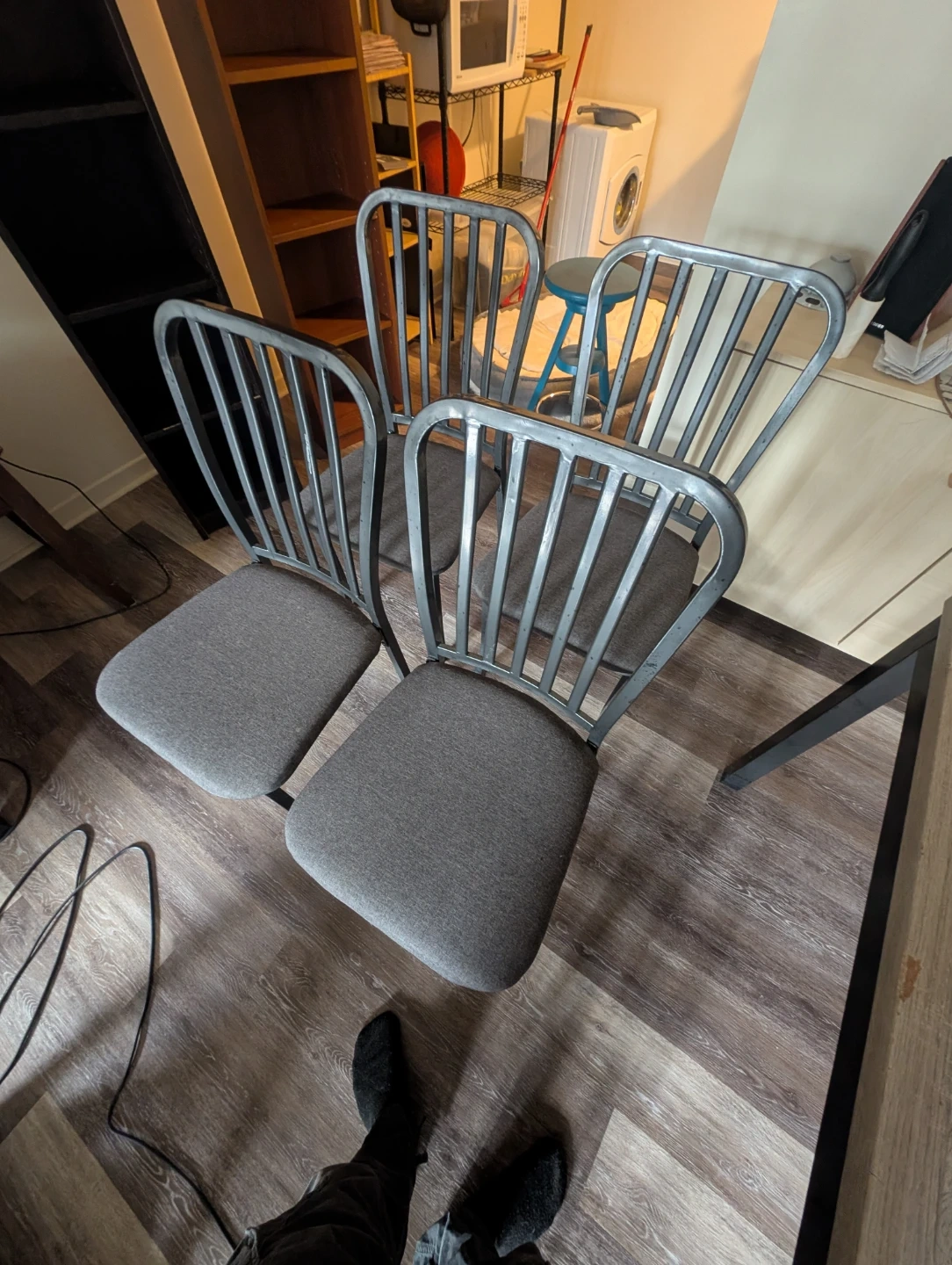 This set includes a dining table with a fo grey wood-grain finish and four matching chairs with upholstered seats. It's suitable for smaller dining areas. Some minor wear is visible on the table corners and markings on top and on chairs but pretty decent otherwise it's mostly metal as well.