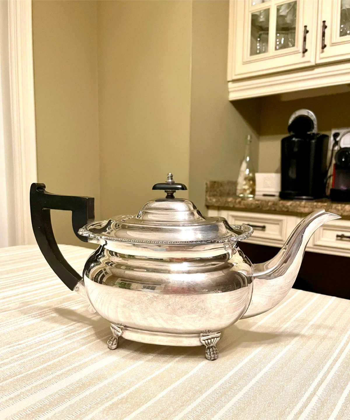 Selling a stunning Viners of Sheffield antique footed silverplated teapot with a scrolled handle made in England.