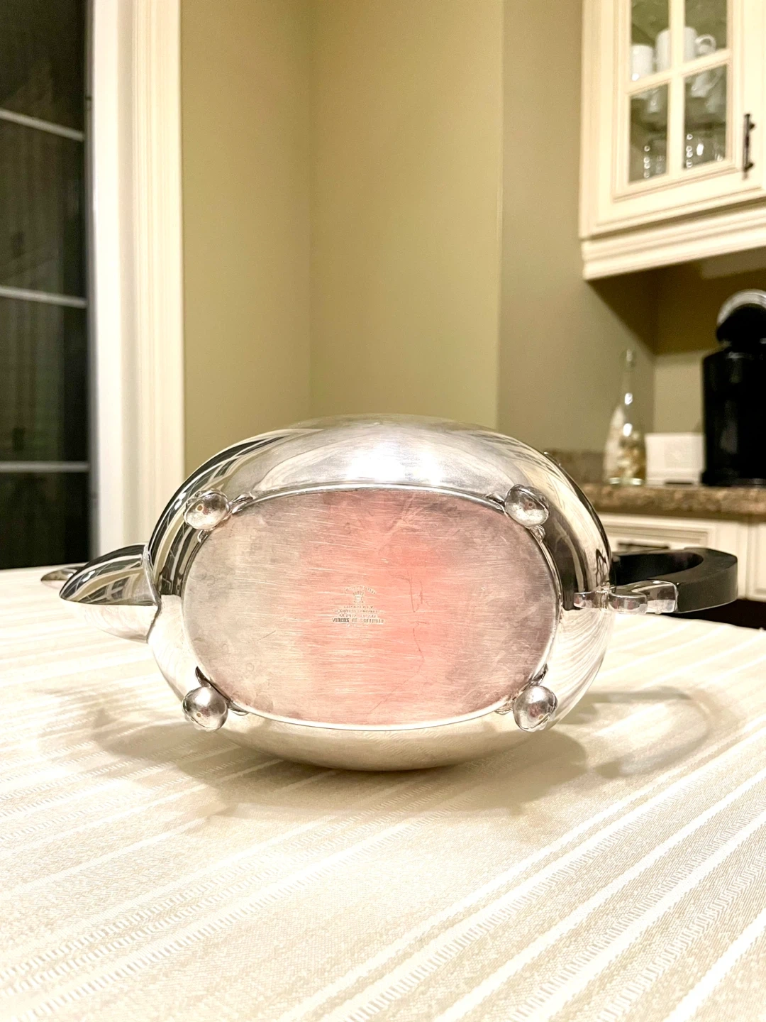 Footed to protect table surface so that heat does not transfer to table.