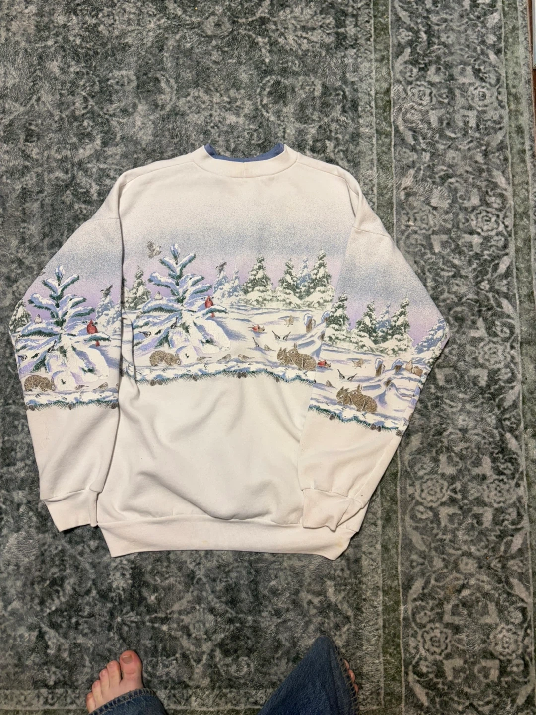 This Artisans Design crewneck sweatshirt features a charming winter scene with woodland creatures and snow-covered trees. It's a size L-XL. The material is likely a cotton blend, offering comfort for cooler days.