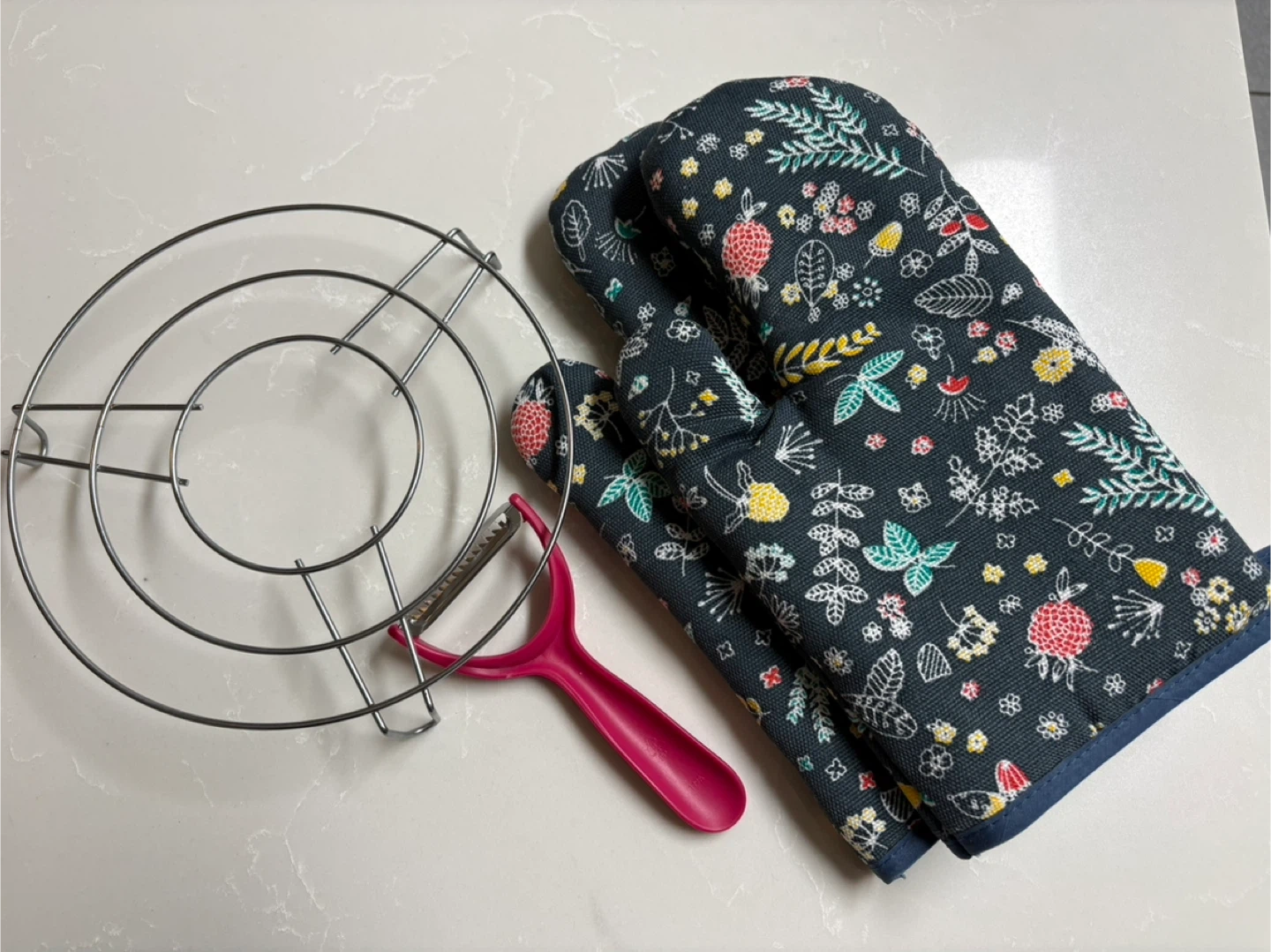 Includes a pair of oven mitts with a floral design, a matching pot holder, a pink vegetable peeler, and a metal pot stand. Also includes a set of five metal chopsticks and a wooden spoon. A Betty Crocker aluminum foil roll is also part of the set. Various kitchen tools and accessories are bundled together for your cooking needs!