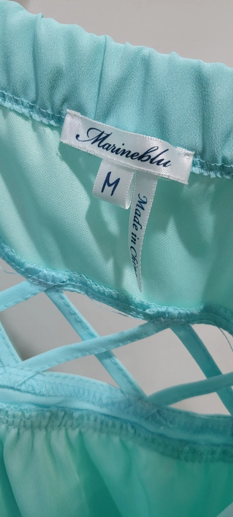 Light blue strapless maxi dress by Marineblu. It features a criss-cross cutout detail at the waist. Size medium. Stored clean and in protective plastic.