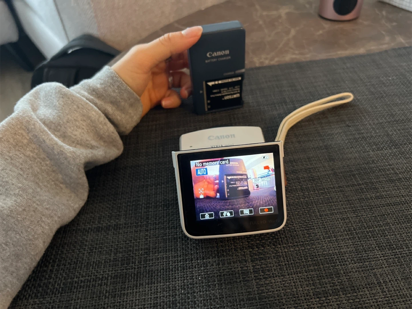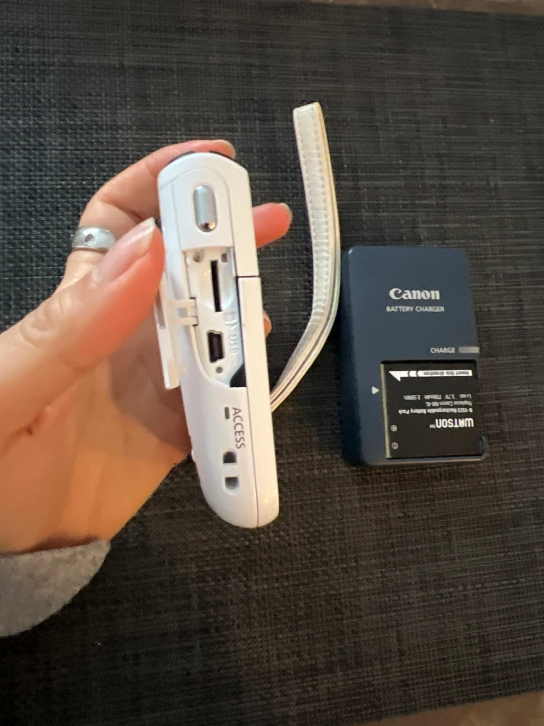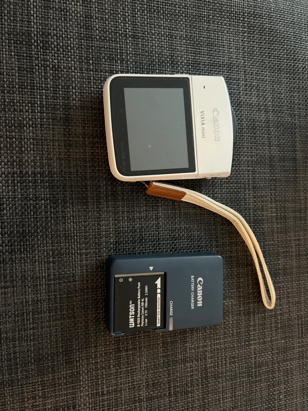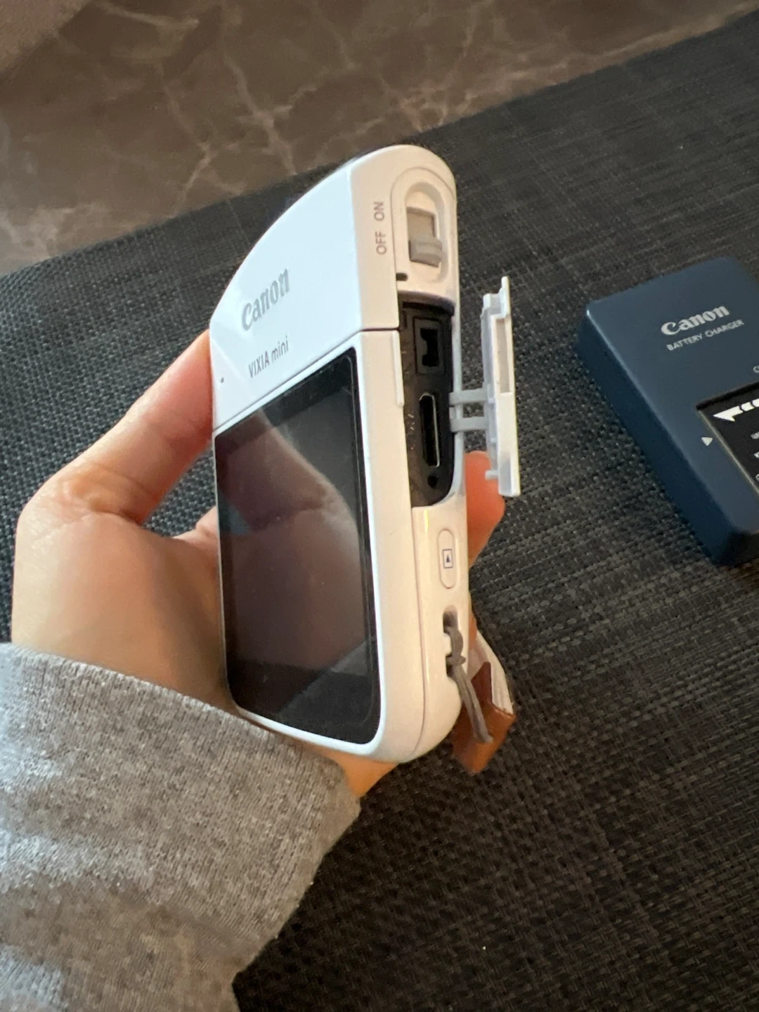 This is a white Canon VIXIA mini camcorder. It comes with a Canon battery charger and a wrist strap. It's a compact digital camera, perfect for capturing everyday moments. It has USB and SD card slots for easy storage and transfer. There is screen protector installed to protect the touch screen!