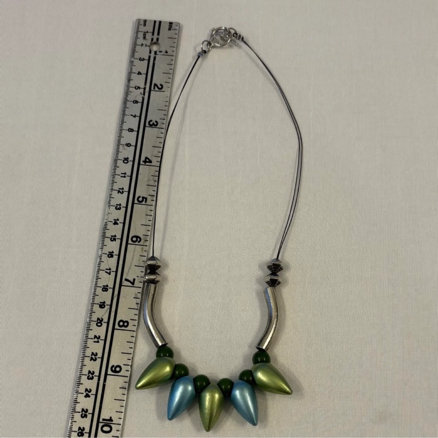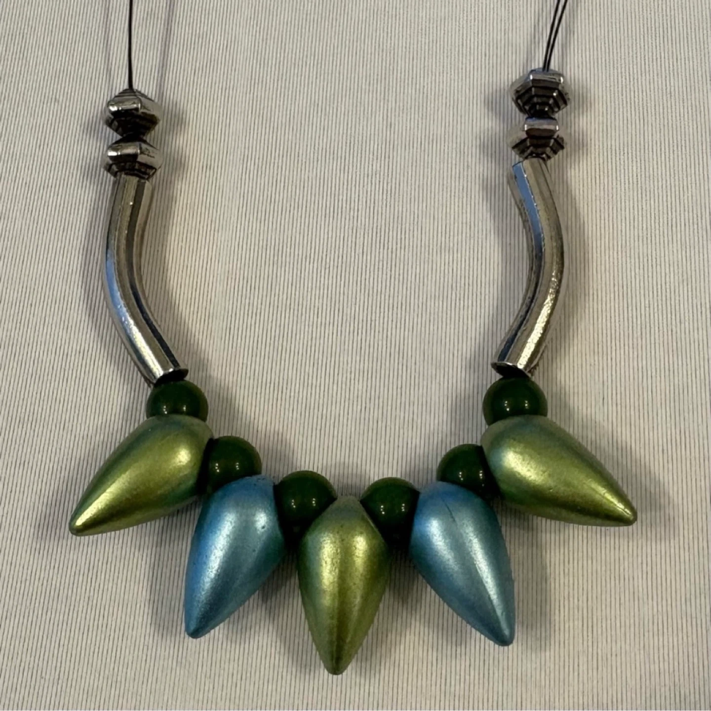 Statement necklace, collar necklace, mod, abstract, spike bead, teardrop, metallic, green, blue, silver tone, unique, art to wear, bold, chunky, toggle clasp