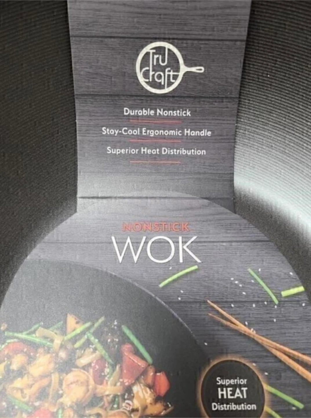This is a Tru Craft nonstick wok. It has a durable nonstick coating and a stay-cool ergonomic handle. Superior heat distribution makes for great cooking! Pick up border of Brampton and Caledon