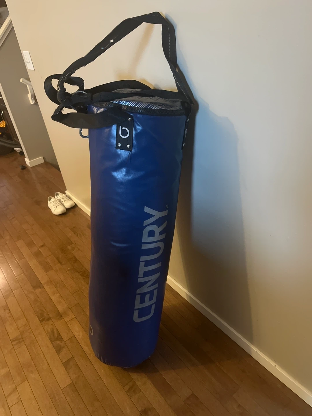 This blue punching bag is from Century. It's a durable option for training. The bag includes a strap for hanging and easier transport. Great for workouts at home or in a gym! Located in Silverado