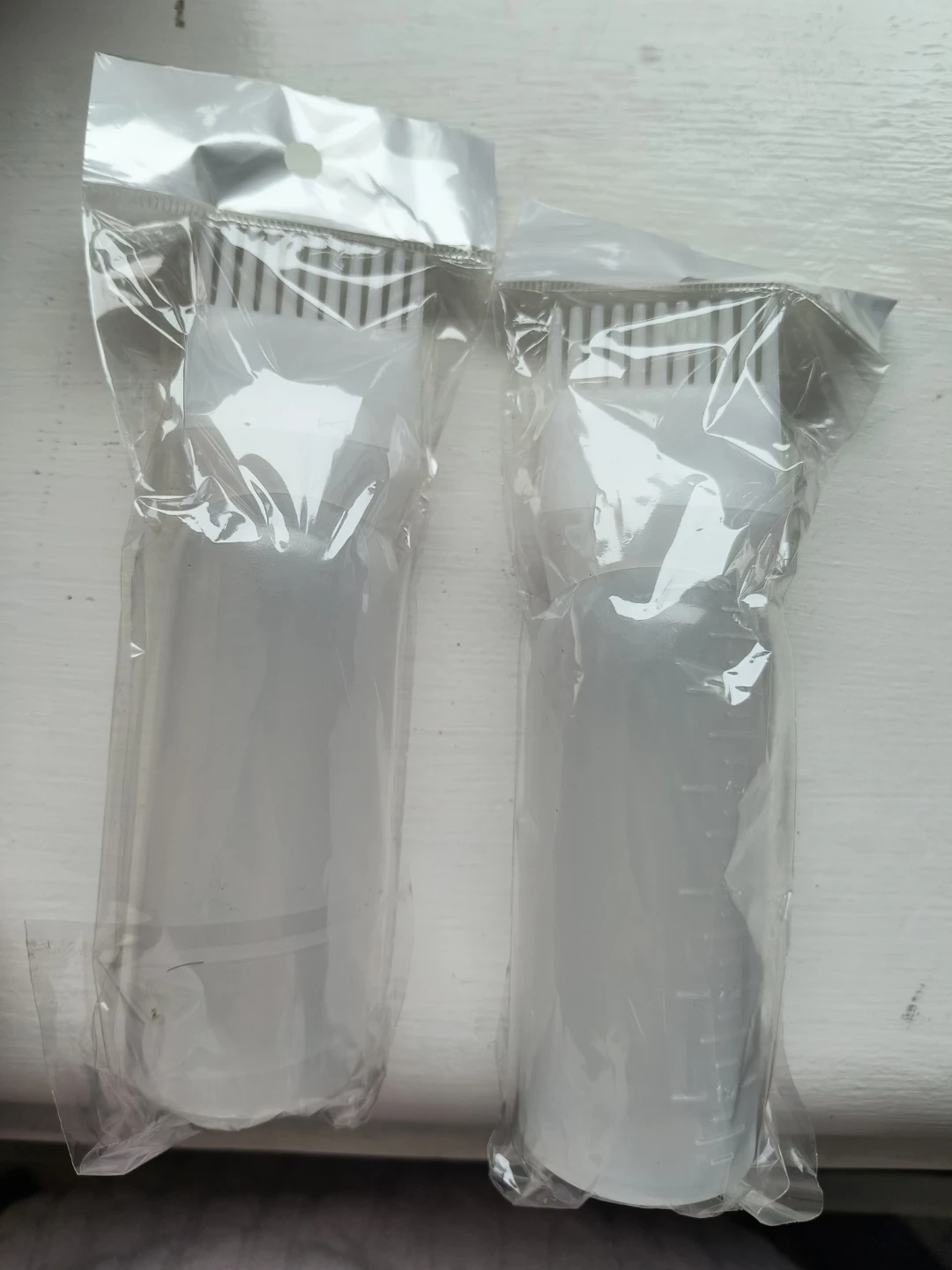 These are two plastic applicator bottles designed for hair dyeing or styling. They each have a comb applicator at the top for even distribution. Measurements are marked on the side of the bottles.